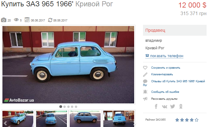 За словами продавця, цей зразок експортного «горбатого Запорожця», 1966 року випуску ідеально підходить для приватної колекції або музею. Ціна – $ 12 тисяч, що порівнянно з новими автомобілями виробництва Запорізького автозаводу.