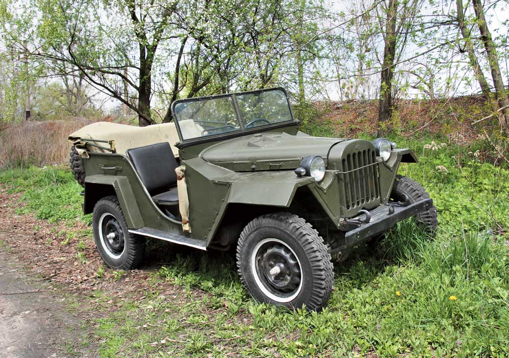 Самый массовый советский джип военного времени был кабриолетом. Наши деды и прадеды доехали до Берлина на машине с мягким верхом без боковин и даже без дверей. Вместо них в ненастье натягивали матерчатые пологи, которые в сухую погоду сворачивали в трубочку и стягивали ремешками. Цветовая гамма также минимально возможная – все внедорожники окрашивались в темно-зеленый матовый цвет «4БГ-авто». Передок кузова конструкторы позаимствовали у грузовика – «полуторки» ГАЗ-ММ.