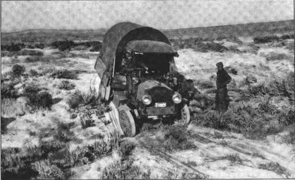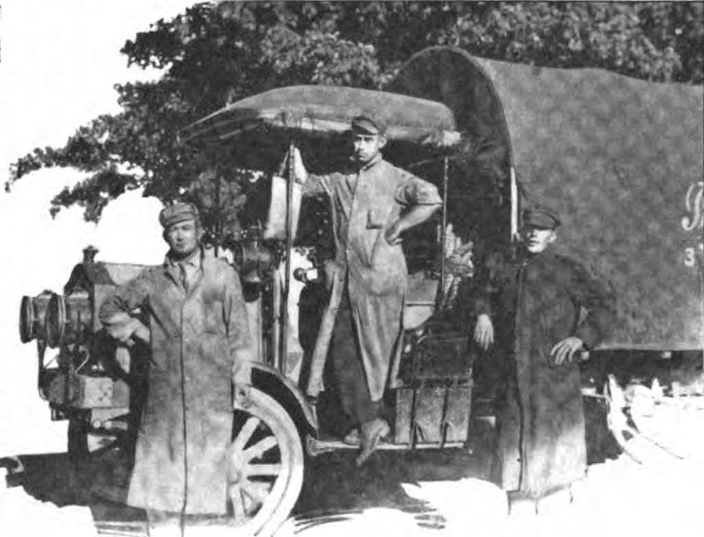 Тритонна вантажівка Packard, що перетнула всю Америку в 1911 році. На фото ліворус: Ернест Леннінг Бернетт, головний водій-випробувач. У центрі: ідентифіковано як Ньюберрі; Праворуч: Арнольд Хенер, водій-помічник. Фотографія з книжки «Слід самотньої вантажівки» (Trail of the Lonesome Truck), автор У. Т. Фішлі, 1911 рік.