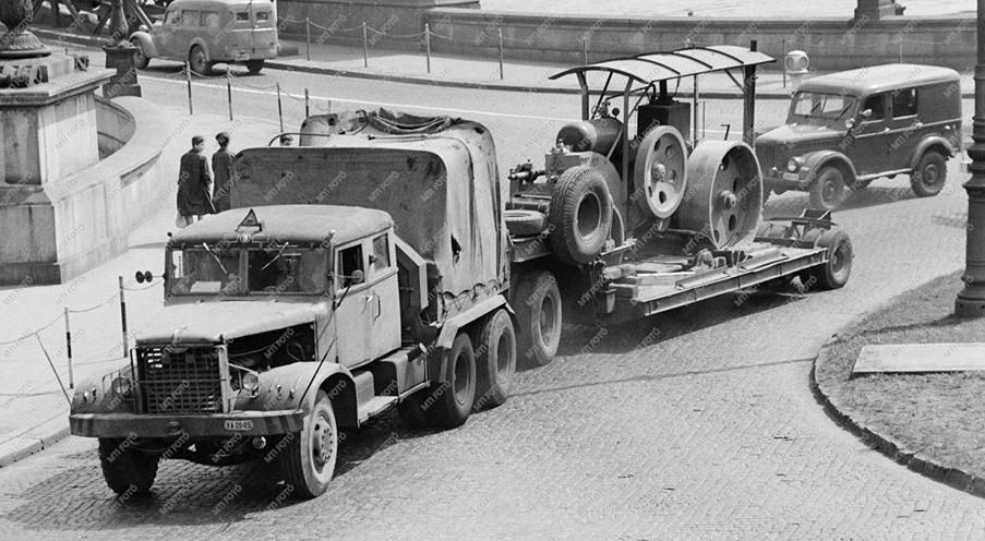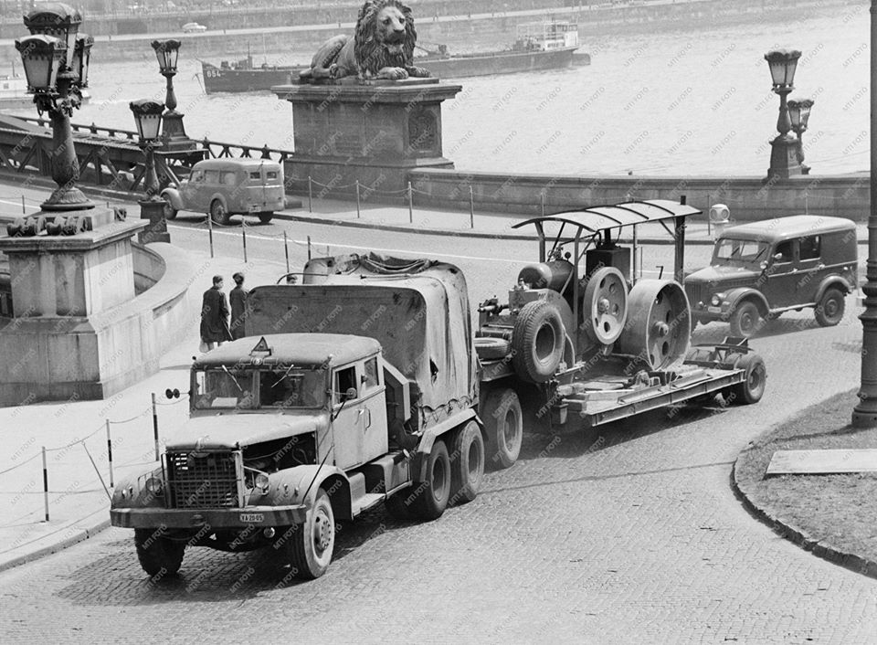 Цей унікальний автопотяг сфотографували наприкінці 50-х – початку 60-х рр. у Будапешті, біля знаменитого Ланцюгового моста. На ньому зображений…ні не КрАЗ, як багато хто міг би подумати, а ЯАЗ. Про приналежність до Ярославського автозаводу свідчить емблема меншого розміру на капоті. У цьому разі баластний тягач перероблено із сідельного – моделі ЯАЗ-221 (6х4). А на причепі у нього розміщений раритетний паровий тягач – так-так, в ті часи їх ще експлуатували.