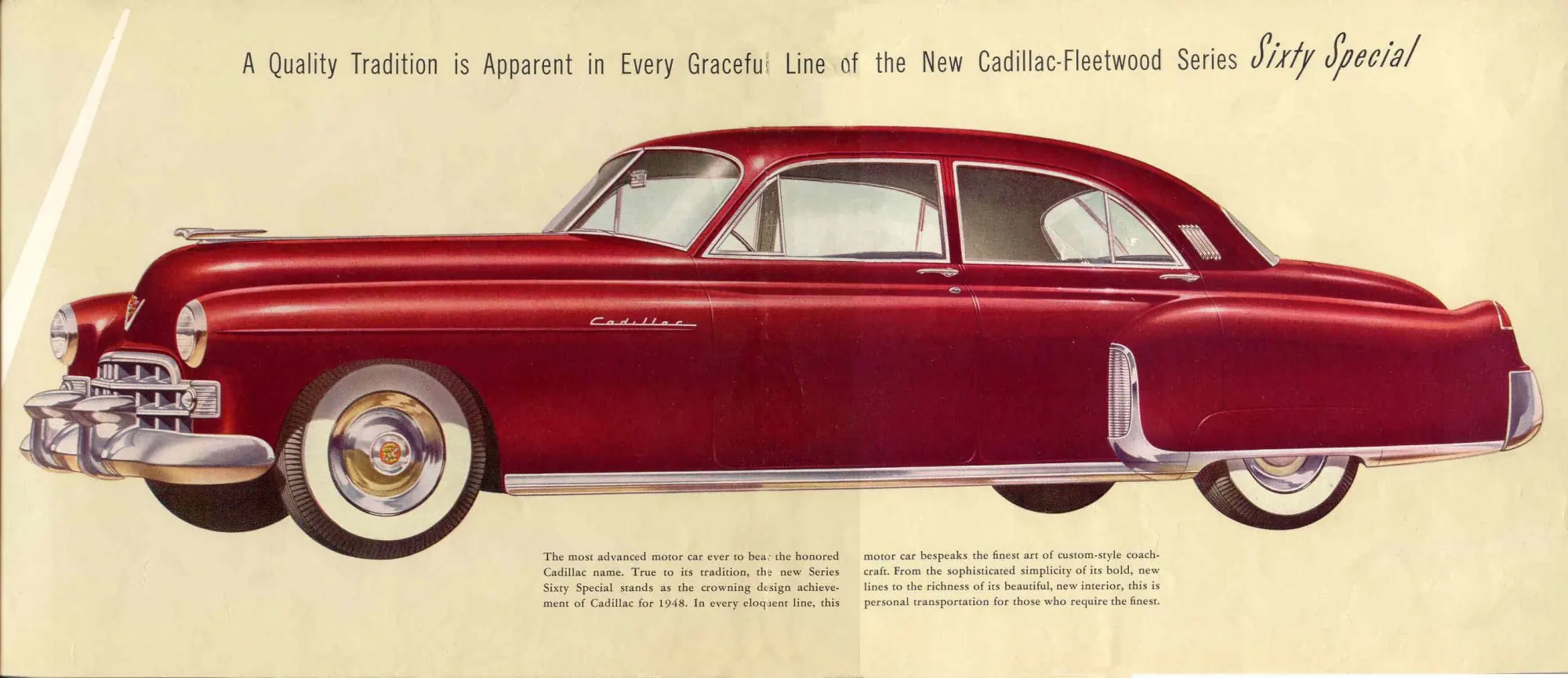 Дизайн першого повоєнного Cadillac - Series 62, моделі 1948 року розробляв відомий стиліст Харлі Ерл. Тут він, вперше на General Motors, застосував кузов понтонного типу – тобто без крил, що стирчать по сторонах. Щоправда, якийсь натяк на заднє крило ще лишався.