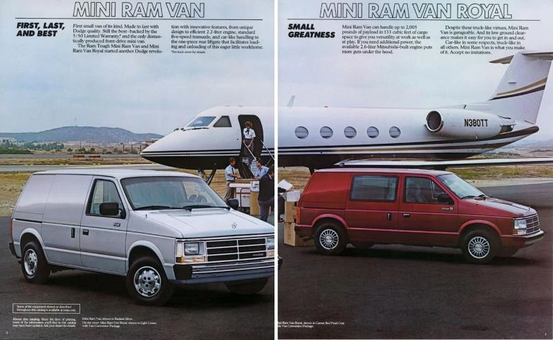 Автомобили выпускались как с короткой, так и с длинной колесной базой (c приставкой Grand в названии). Габаритная длина составляла соответственно 4468 мм и 4839 мм. В стандартной версии машина вмещала пять пассажиров, а в версии LE – уже семь при трехрядном размещении. Второй ряд сидений можно было сложить, а два сиденья в третьем ряду и вовсе демонтировать. Это позволяло существенно увеличить объем багажного отсека. В 1984 году была запущена и грузовая версия – Mini Ram Van, рассчитанная на 770 кг.