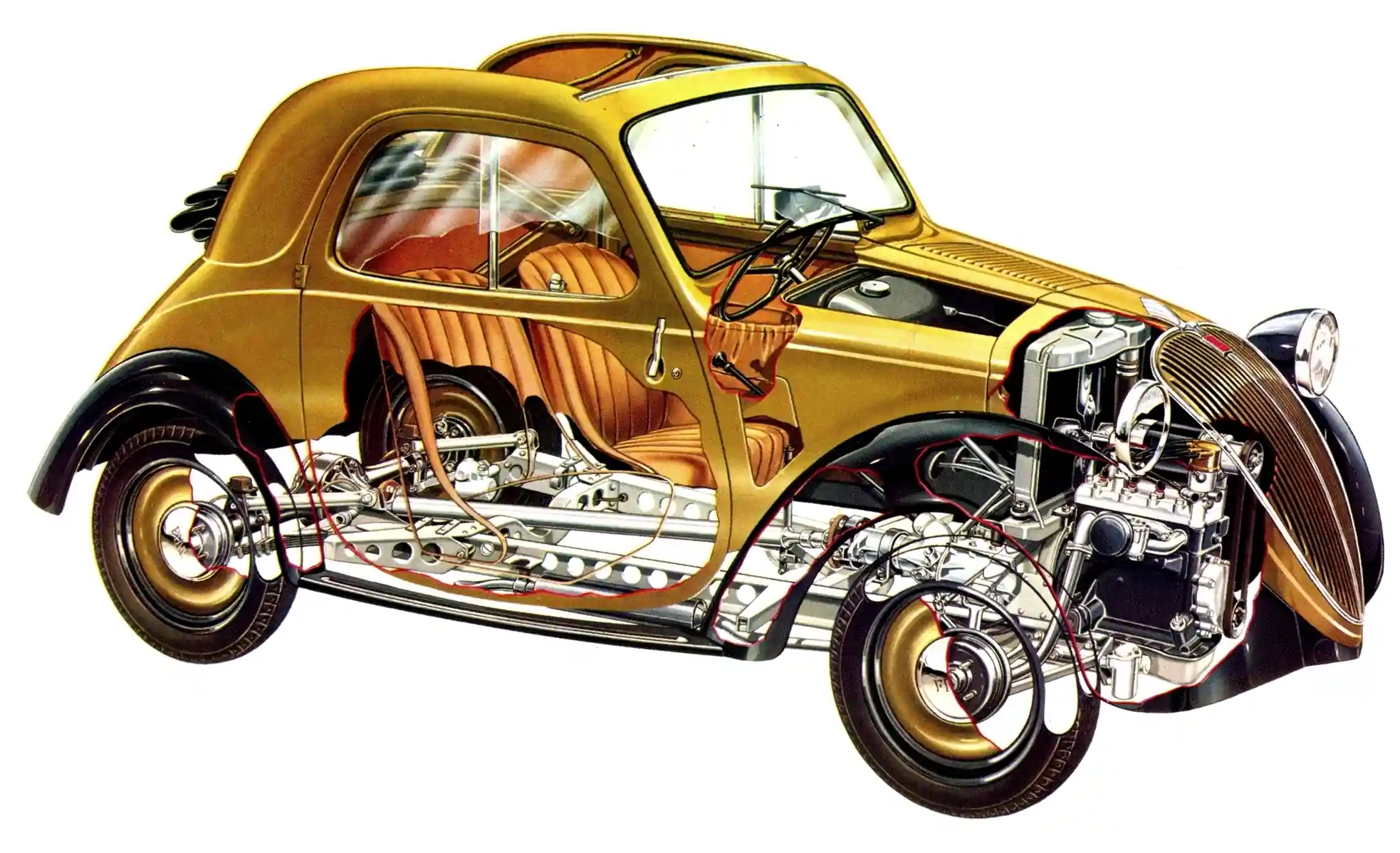 7 квітня 1936 року дебютував Fiat 500 – свого часу найкомпактніший автомобіль масового виробництва. Машина була завдовжки 3215 мм, завширшки 1275 мм, та заввишки 1377 мм, з колісною базою лише 2000 мм.
