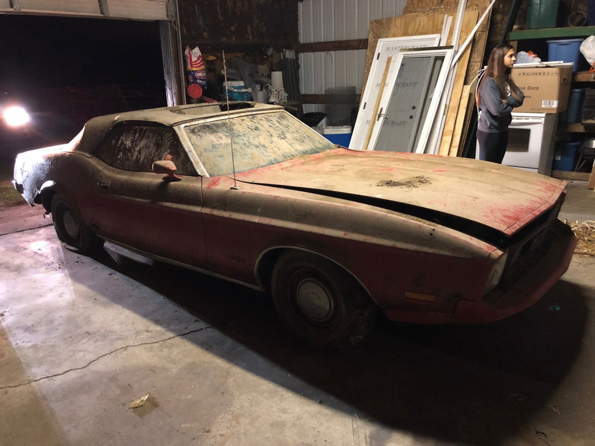 Раритетный кабриолет Ford Mustang 1973 года выпуска забыли в заброшенном сарае еще в середине 80-х