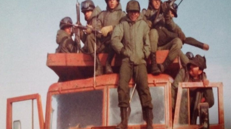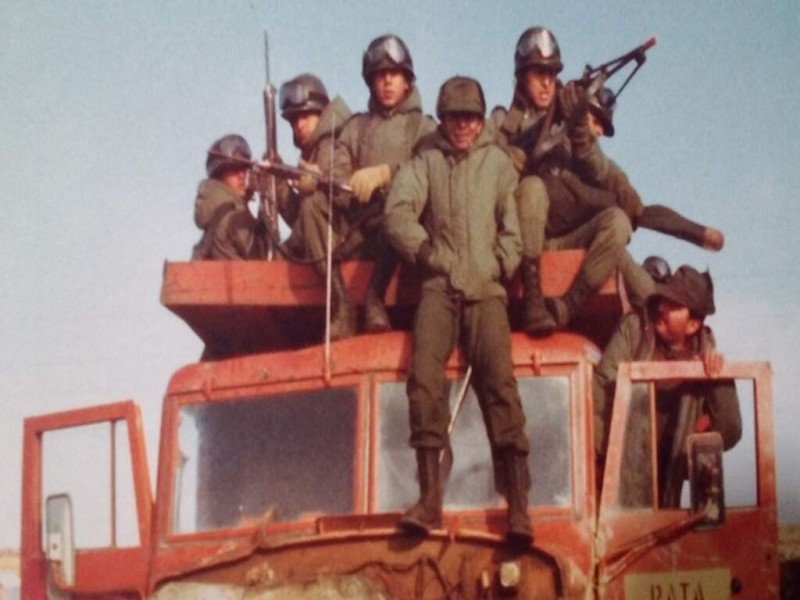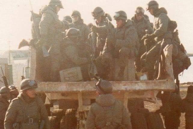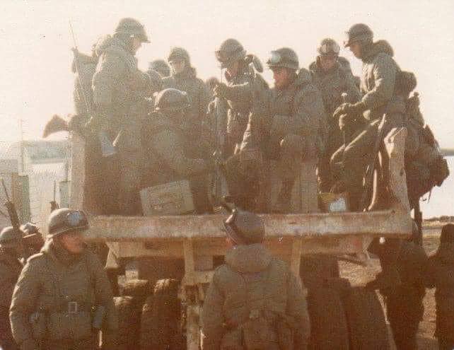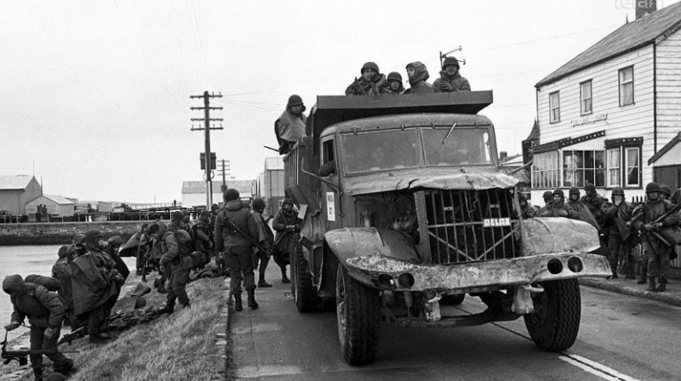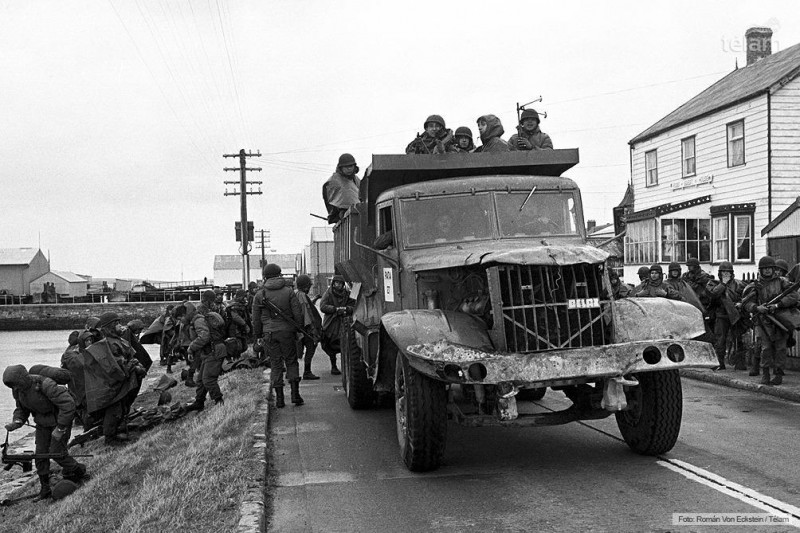 На фото изображены самосвалы КрАЗ-256Б, на которых перемещаются аргентинские повстанцы. Эти машины эксплуатировались на островах британскими компаниями и были захвачены во время конфликта.