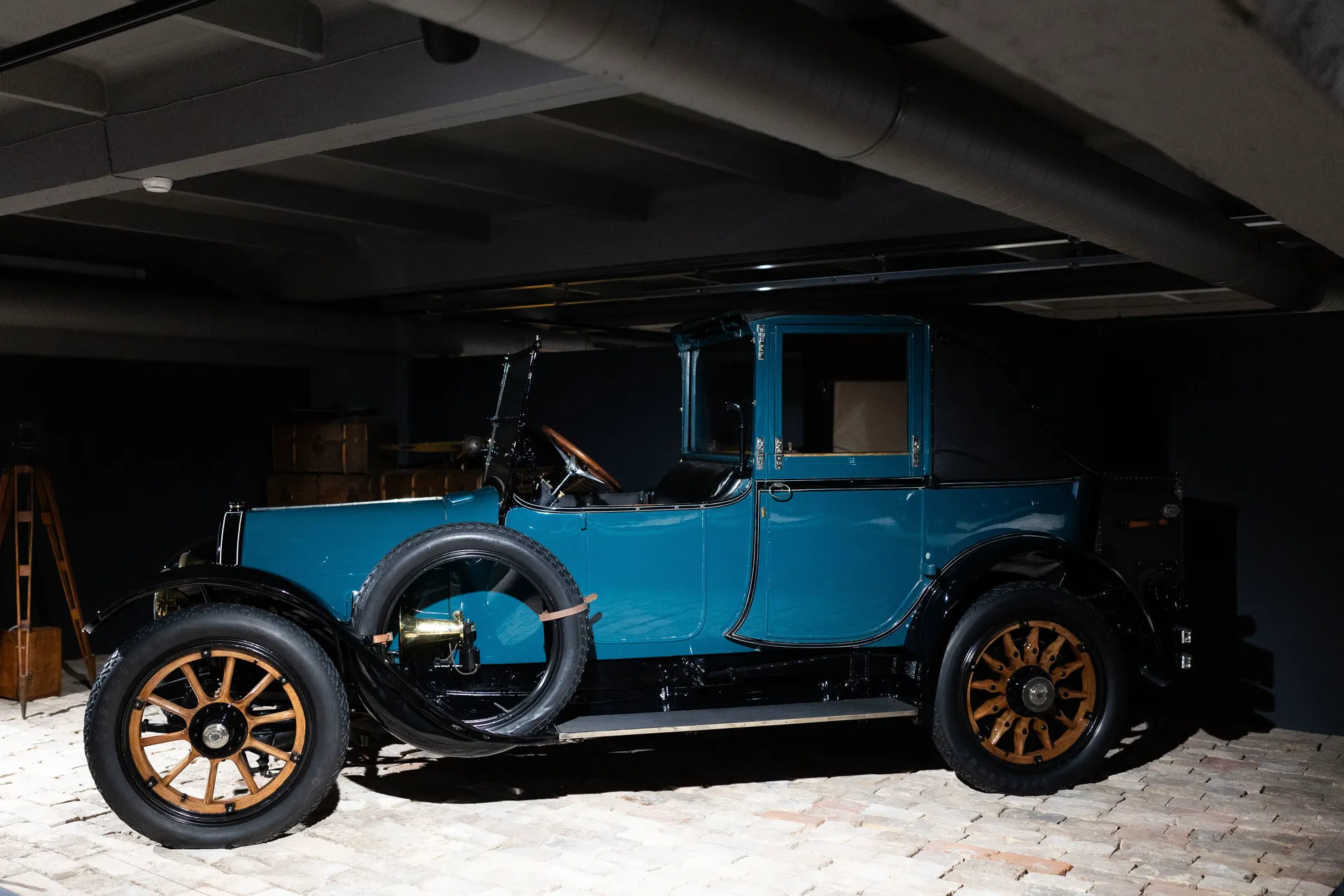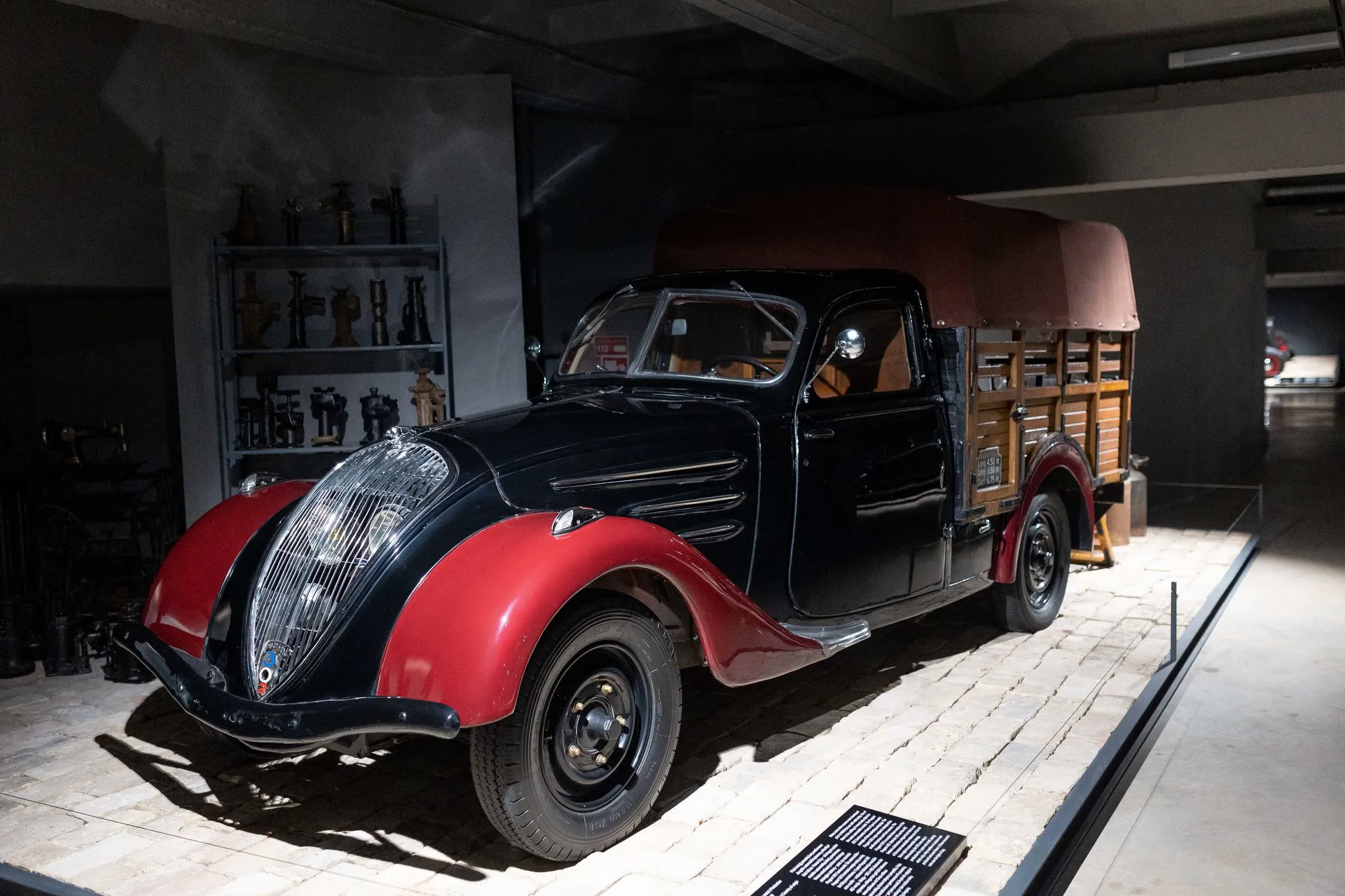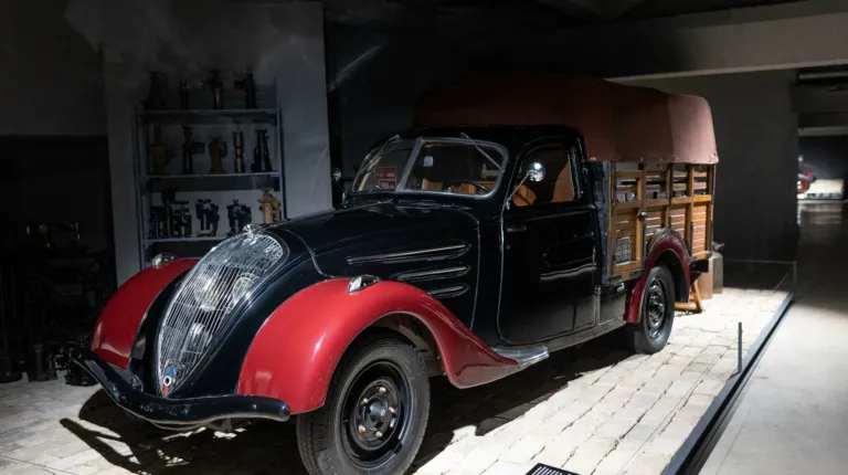 Цікава й легка французька вантажівка Peugeot 402, представлена в музеї з тентованим кузовом для продуктів.
