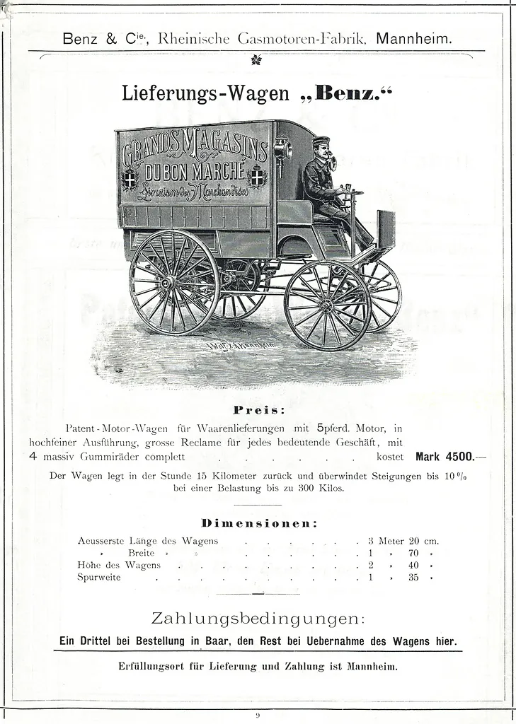 Легкий автомобіль для доставки вантажів був розроблений та побудований компанією Rheinische Gasmotorenfabrik Benz & Cie. з Мангейма у далекому 1896 році. Ця машина з'явилася у каталозі фірмі вже у травні. Цікаво, що першим покупцем стали не німці – машину замовили для відомого паризького універмагу Du Bon Marché. Автомобіль з логотипом цього магазину був увічнений у рекламному буклеті виробника.