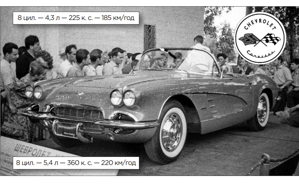Chevrolet Corvette на виставці «Пластмаси в США», що проходила в Києві влітку 1961 року. Світлина з авторського фотоальбому Леоніда Гоголєва «Іномарки 60-х років на вулицях Києва» (Видавництво «Мистецтво», 2024 р.).