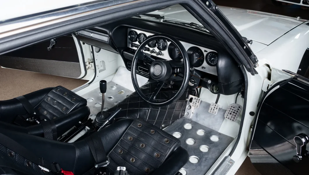 У салоні спорткара також немало змін. Тут фахівці JDM Legends встановили ковшеподібні сидіння з фіксованою спинкою, обшиті чорною шкірою, та ременями безпеки Crow Enterprises. Ще рульове колесо Datsun Competition, напівкаркас безпеки, карбонові та алюмінієві вставки. Також додали в оснащення вогнегасник та паливний елемент ATL, встановлений у багажнику.