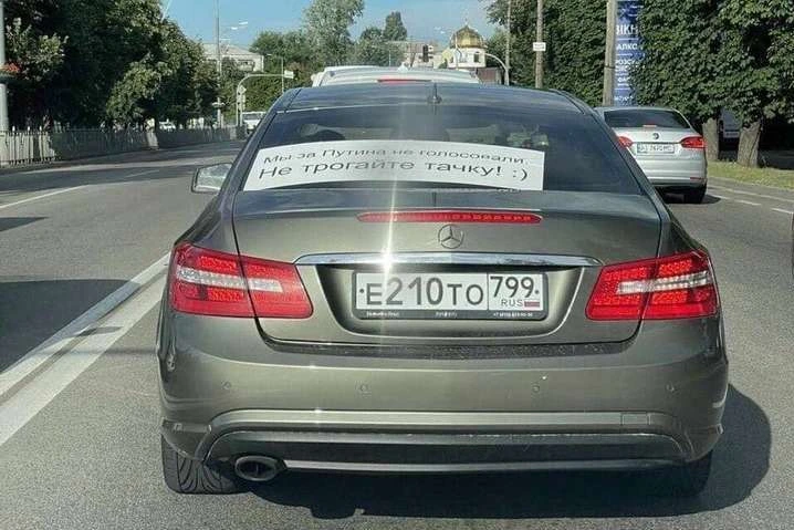 Наприклад, власник Mercedes з московськими номерами, який був помічений в Броварах (Київська область), вирішив підстрахуватися і закріпив на задньому склі напис: "Ми за Путіна не голосували, не чіпайте тачку!". Завершує цей заклик усміхнений смайлик.