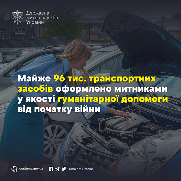 За даними Митної служби України, з початку війни сукупно до країни ввезено 1 344 222 тонн гуманітарних вантажів. Серед них майже 96 тисяч транспортних засобів.