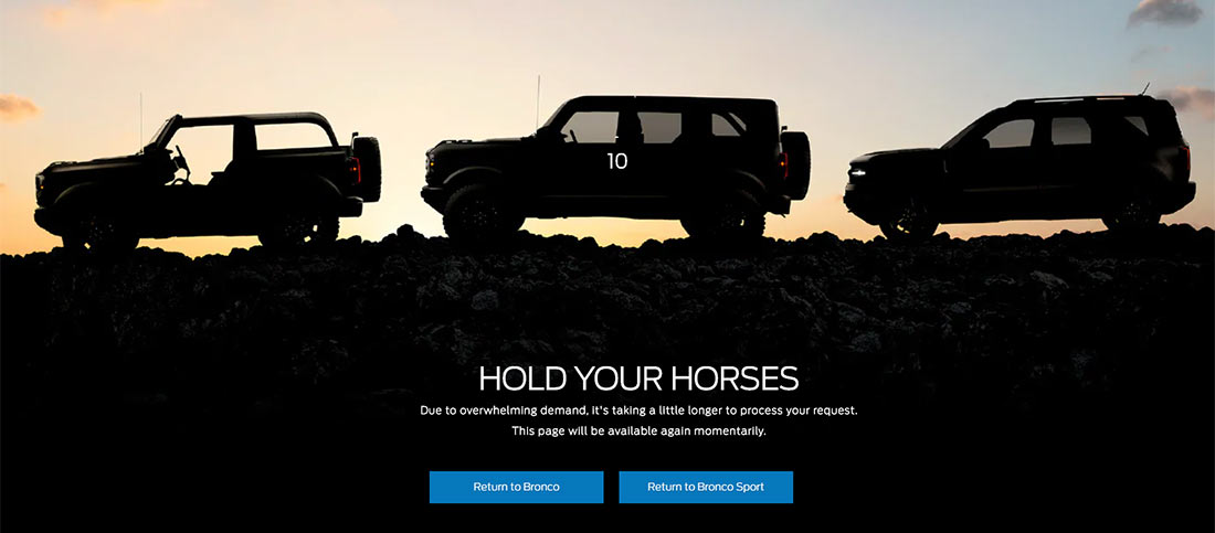 Відроджений Ford Bronco викликав справжній фурор на ринку. Шанувальники марки ледве дочекалися його дебюту, після чого почали штурмувати офіційний сайт компанії, щоб оформити попереднє замовлення. На жаль, сайт не був готовий до такої кількості охочих і просто “ліг”.