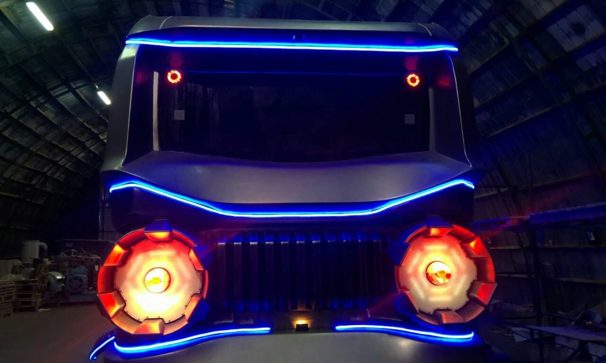 В основе звездолета на колесах лежит туристический автобус Ataman A096 на японском шасси ISUZU c двигателем в 190 коней. Сегодня он выпускается на предприятии «Черкасский автобус». Машину обклеили эффектными стеклопластиковыми панелями и украсили фантастической светодиодной подсветкой. Машина прошла долгий путь испытаний и сертификации и теперь готова к эксплуатации.