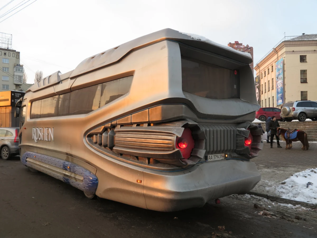 Футуристический украинский автобус построен для перевозки детей. Только не в качестве школьного, а как экскурсионный, который совершает поездки на кондитерскую фабрику известного бренда. В салоне – 34 комфортабельных кресла, оснащенных двухточечными ремнями безопасности.