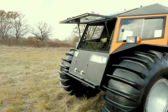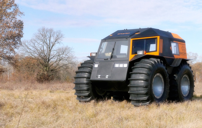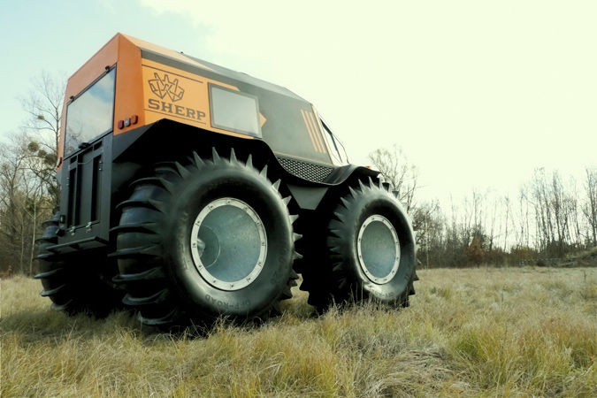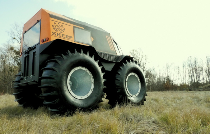 SHERP PRO имеет герметичный алюминиевый кузов, благодаря чему он легко может плавать. Длина его – 3,4 м; ширина и высота имеют одинаковые параметры – 2,52 м. Изюминка вездехода – запатентованные шины сверхнизкого давления объемом 800 л каждое. Благодаря пневмоциркулярной подвески можно очень быстро изменять давление в каждом из колес. Дорожный просвет впечатляет – 600 мм.