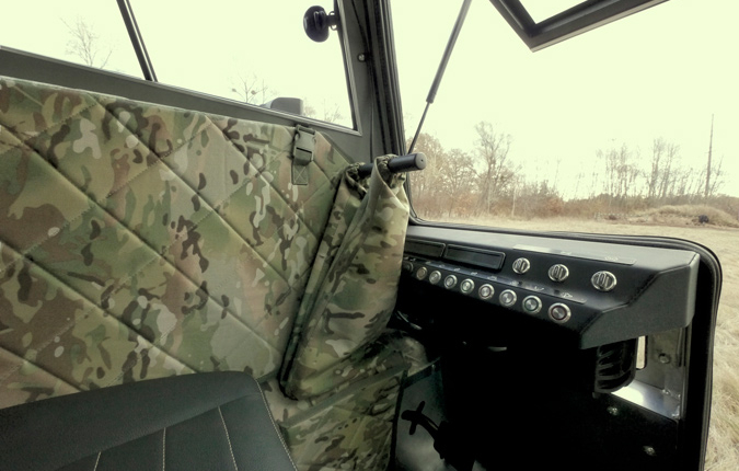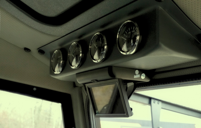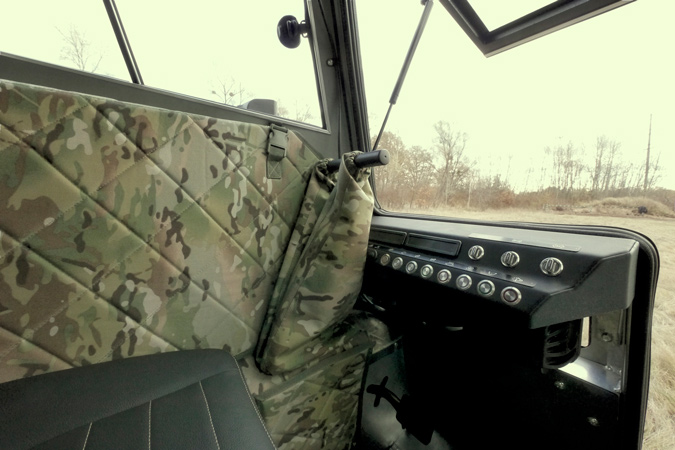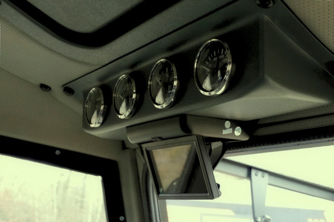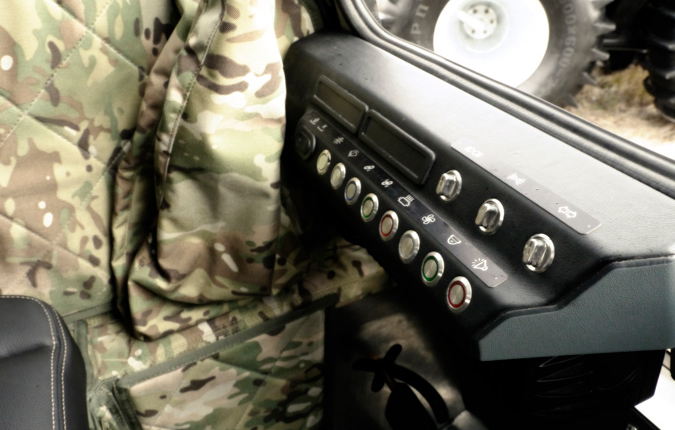 Максимальная скорость на суше – 45 км/ч, а на плаву – до 6 км/ч (за счет движения колес). Управления вездехода с помощью рычагов и педалей. В салоне установлен автономный отопитель Webasto и есть возможность оборудовать четыре спальных места.