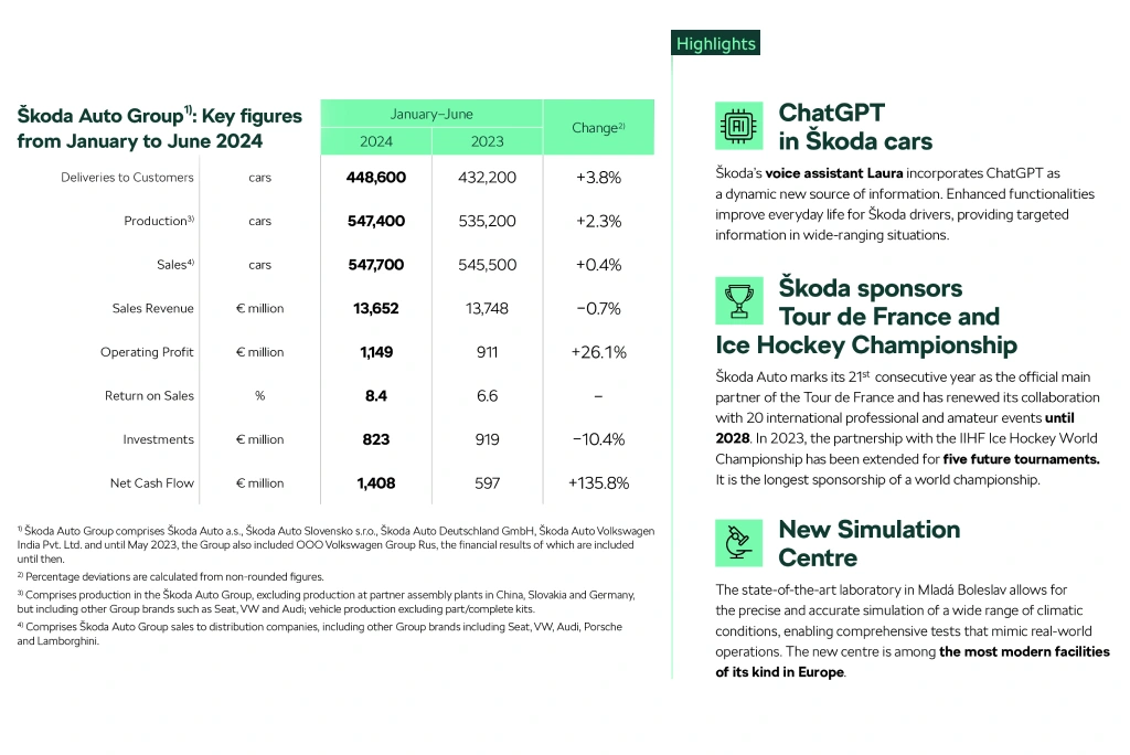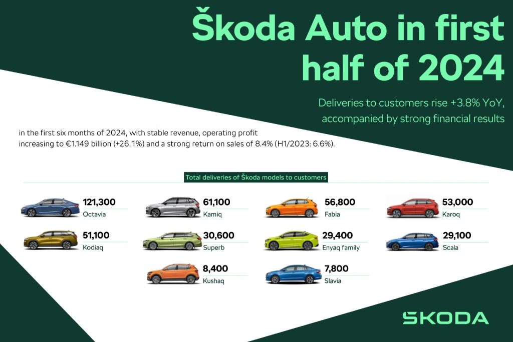 У перші шість місяців 2024 року Skoda Auto продемонструвала значну фінансову силу. Операційний прибуток зріс до 1,149 мільярда євро (+26,1%), а рентабельність продажів зросла до 8,4% (перше півріччя 2023 року: 6,6%). Ключем до цього успіху є найповніша лінійка продуктів в історії бренду, яка поєднує найкраще з обох світів. Це сприяло збільшенню поставок 448 600 автомобілів у всьому світі на 3,8% порівняно з минулим роком.У перші шість місяців були представлені новітні покоління Superb і Kodiaq, а також оновлені версії Scala, Octavia і Kamiq. Одним із головних факторів є Octavia, модель-бестселер, постачання якої клієнтам зросли на 24,1% порівняно з минулим роком.
