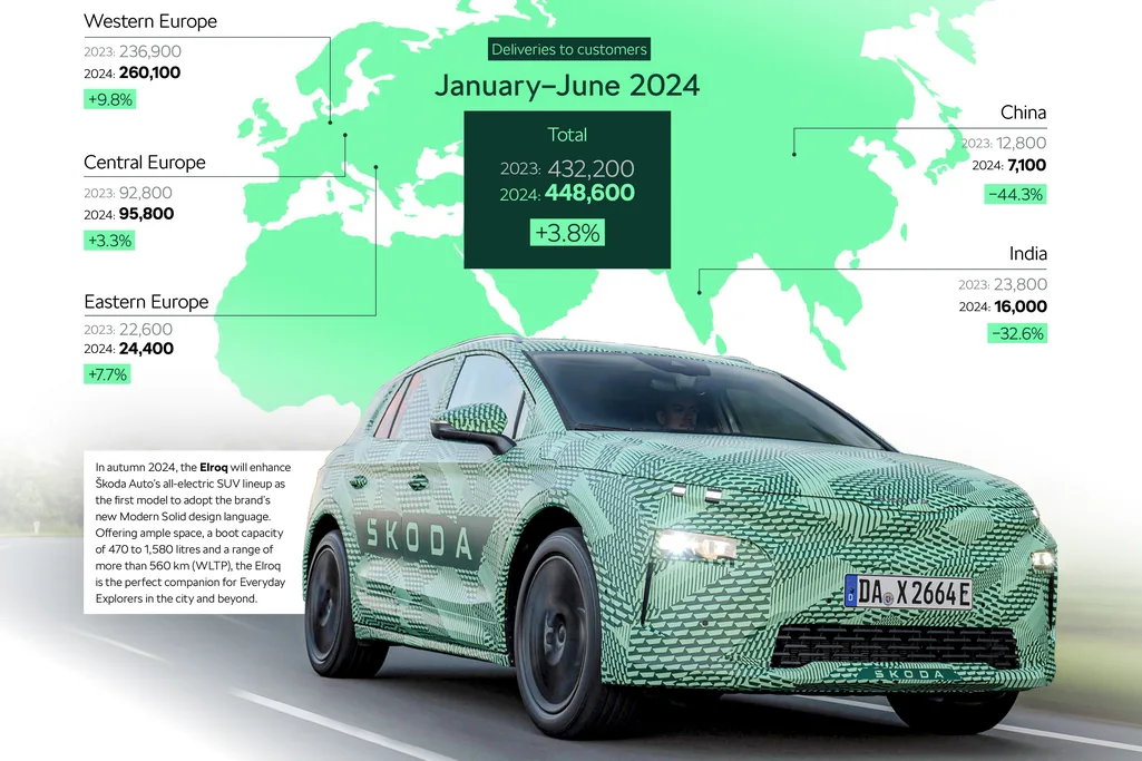 У рамках своєї стратегії наступного рівня 2030, Skoda Auto поставила перед собою амбітну мету увійти до п’ятірки найбільш продаваних брендів у Європі. Перевищивши цю мету, у першій половині 2024 року Skoda досягла найкращої позиції на європейському ринку та наразі є четвертим найбільш продаваним брендом за реєстраціями в Європі.Цей успіх можна пояснити послідовним фокусуванням на конкретних потребах клієнтів у кожному регіоні. Найефективнішими ринками були Німеччина (91100 автомобілів; +13 800), Польща (31500; +4300), Франція (21500; +3800) і Велика Британія (37600; +3400). Значного зростання було досягнуто в країнах Південної Європи, таких як Хорватія (5500; +2100), Іспанії (17500; +1900) та Італії (19300; +1800). Туреччина (18800; +1300) також зафіксувала помітне зростання.