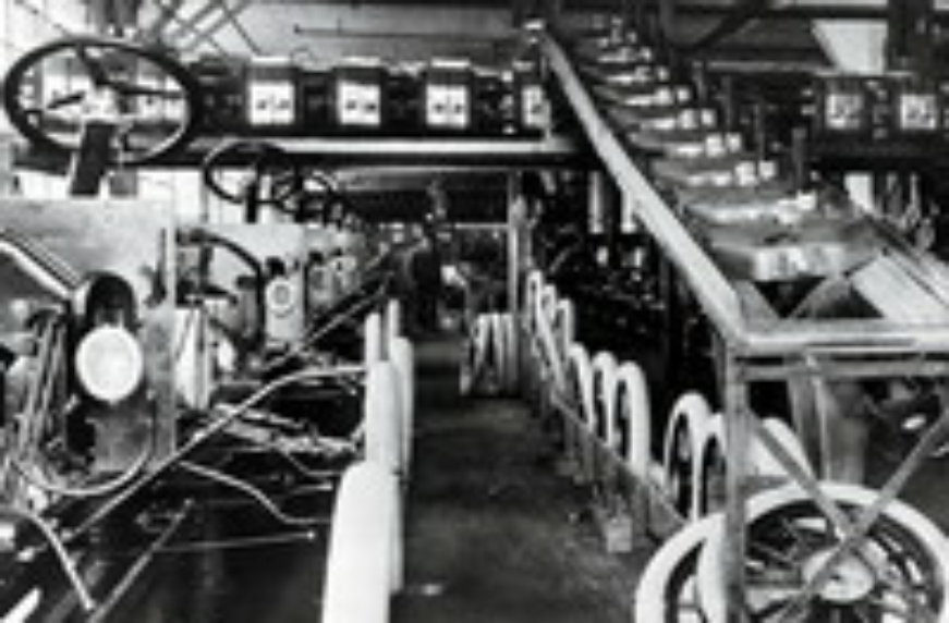 В 1908 году, когда Форд пришел к выводу, что продать десять недорогих авто десяти покупателям проще, чем один дорогой – одному богатому клиенту. Для этого необходимо было модернизировать производство. Низкую себестоимость и массовость мог обеспечить конвейер, который до этого использовался… на чикагской бойне при разделке туш. Опробовали преимущества конвейера при сборке магнето, а в 1913 году началась полномасштабная конвейерная сборка автомобилей Ford-T.