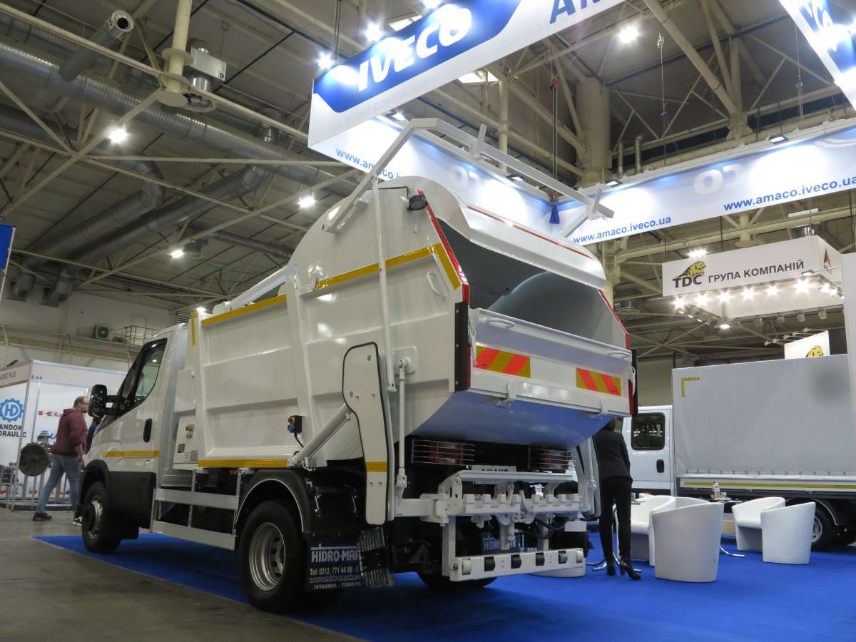 Почнемо з виставки «Комунтех-2019», яка проходила в столичному МВЦ. Тут компанія АМАКО на своєму стенді презентувала два автомобілі. Пеередусім відзначимо гідравлічний компактор турецького виробника Hidro-Mak, модель Monoblok SCK-5. Це компактний сміттєвоз, який оптимально підходить для роботи в зонах щільної забудови – наприклад, в історичному центрі міст. Така машина дає змогу оперативно збирати тверді побутові відходи на маршруті, а потім перевантажувати їх у місткіші сміттєвози для вивезення на полігон.