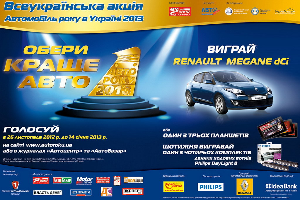 Сегодня, 14 января – последний день, когда можно проголосовать во Всеукраинской акции Автомобиль года в Украине 2013. Голосуйте – и получайте подарки! В этом году среди проголосовавших в акции разыгрываются 28 комплектов дневных ходовых огней Philips (4 комплекта еженедельно; завтра – розыгрыш последних огней!) 10 подарочных сертификатов от «Базы автозвука», 3 планшета и стильный дизельный Renault Megane dCi (по окончании акции в середине февраля).