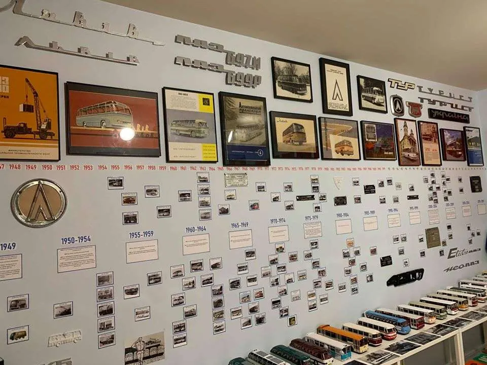 Найцікавіше, що помістилася вона не просто в одній будівлі, а лише в одній кімнаті. Чого тут тільки немає. На стінах розвішені фотографії та рекламні буклети минулих років - причому тут не тільки автобуси, є і автокран ЛАЗ-690 на шасі ЗІЛ-164. До речі, цей самий автокран представлений і у вигляді масштабної моделі 1:43, а поруч з ним стоять копії автобусів різних років, зокрема і дослідні зразки.