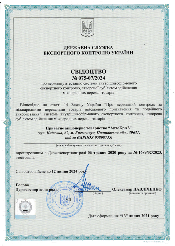 ЧАО «АвтоКрАЗ» успешно прошло государственную аттестацию системы внутрифирменного экспортного контроля, что позволяет предприятию заниматься экспортном и импортом военной продукции