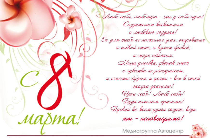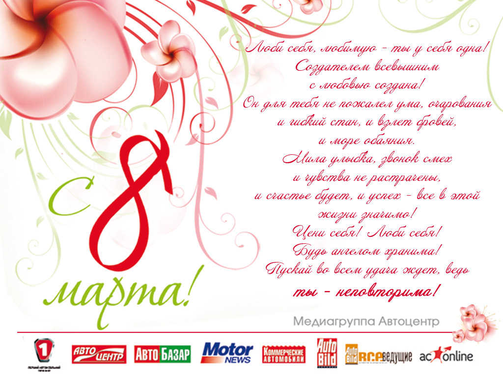 Медиагруппа «Автоцентр» поздравляет всех женщин и девушек, за рулем и не за рулем, тех, кто уже умеет водить автомобиль и тех, кто только собирается этому учиться, – словом, ту половину человечества, которая делает мир прекраснее, с праздником Весны! От всей души желаем вам любви и нежности, внимания и понимания, успехов во всех начинаниях и безграничного счастья. Пусть всех вас по жизни сопровождает улыбка!