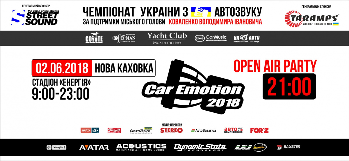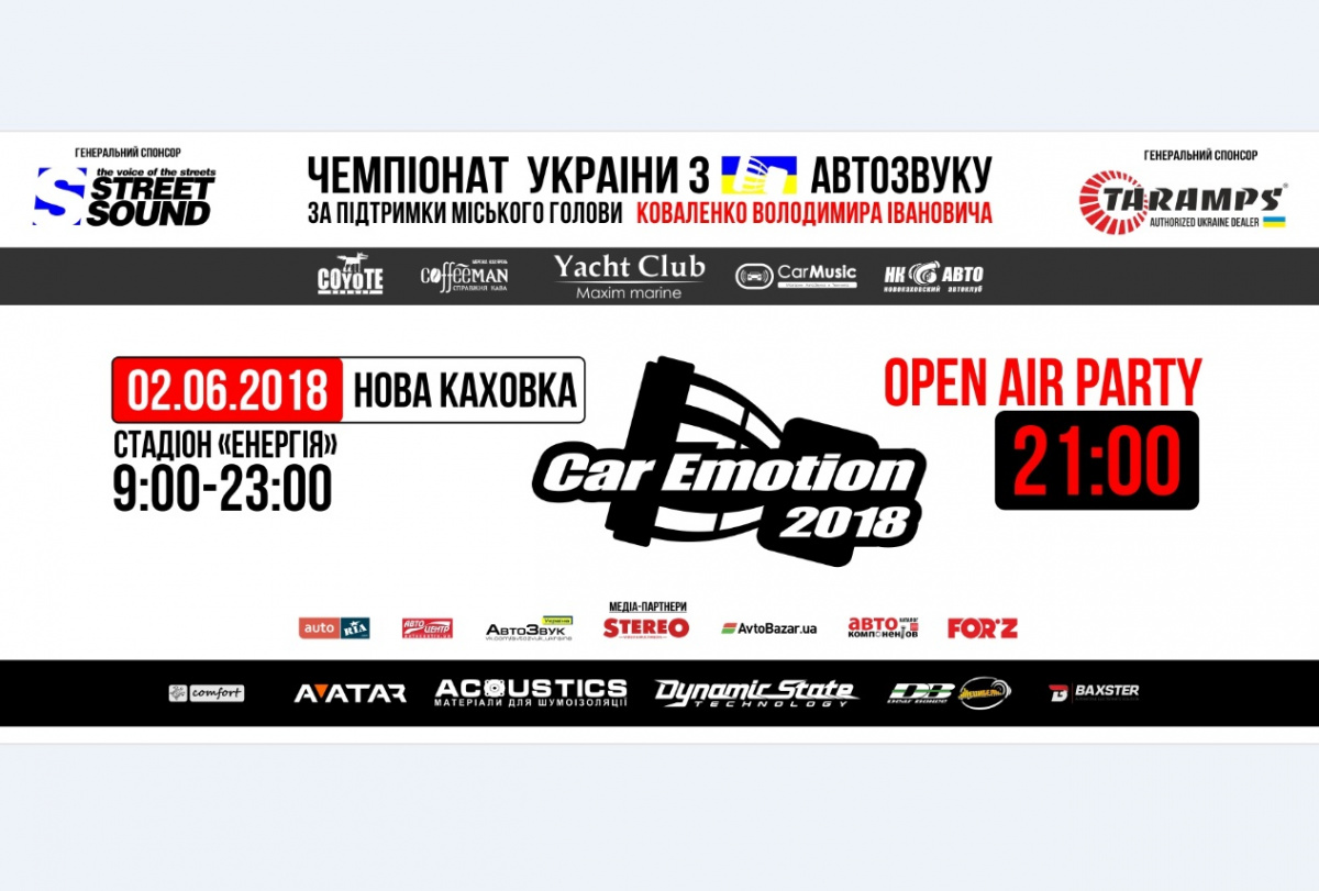 2 июня 2018 г. площадь стадиона «Энергия» заполнят самые громкие автомобили страны, г.Новая Каховка открывает новый соревновательный сезон Чемпионата Украины по АвтоЗвуку в формате Car Emotion. В этом замечательном городе на Юге Украины и был зарожден чемпионат еще в далеком 2010 году.