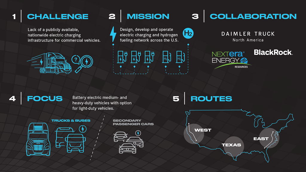 Нове СП займеться проєктуванням, розробкою, установкою і експлуатацією високопродуктивних зарядних комплексів, що обслуговують транспортні засоби середнього і важкого класу, зокрема на водневих паливних елементах. Мережа станцій розгорнеться на найважливіших вантажних маршрутах уздовж східного і західного узбережжя і в Техасі до 2026 року будівництво перших об’єктів розпочнеться вже в 2023 році. Очікується, що початкові інвестиції, розділені порівну між сторонами, становитимуть 650 млн доларів.