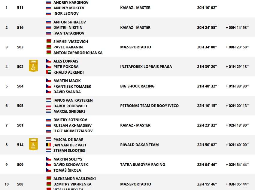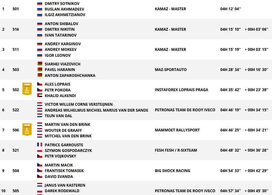 Особого внимания заслуживает пятое место, которое занял известный чешский гонщик Алеш Лопрайс из команды Instaforex Loprais. В итоговой таблице грузового зачета после первой трети гонки он поднялся на четвертое место, пропустив вперед россиян и белорусов.