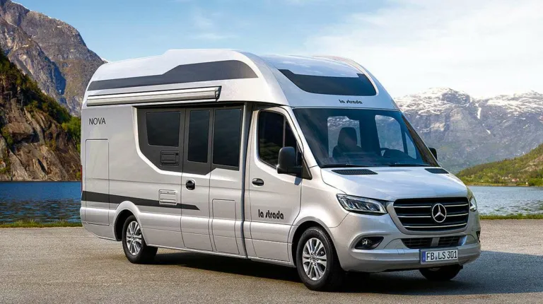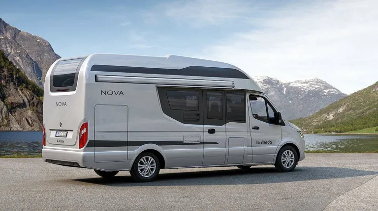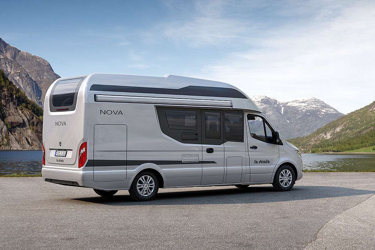 Новинку привезла и компания La Strada. Топовая модель Nova получила более вытянутый и динамичный вид. Кемпер предлагается в двух вариантах по длине – на 6,46 м и 6,99 м. Кузов типа монокок изготовлен из стеклопластика GFK. Фурнитура дверей и откидных крышек ювелирно интегрирована в кузов – петлей и замков совсем не видно. Большое заднее окно обеспечивает лучшую обзорность. Базовым является шасси Mercedes-Benz Sprinter c двигателем не менее 163 л.с. Цена – от 95 430 евро.