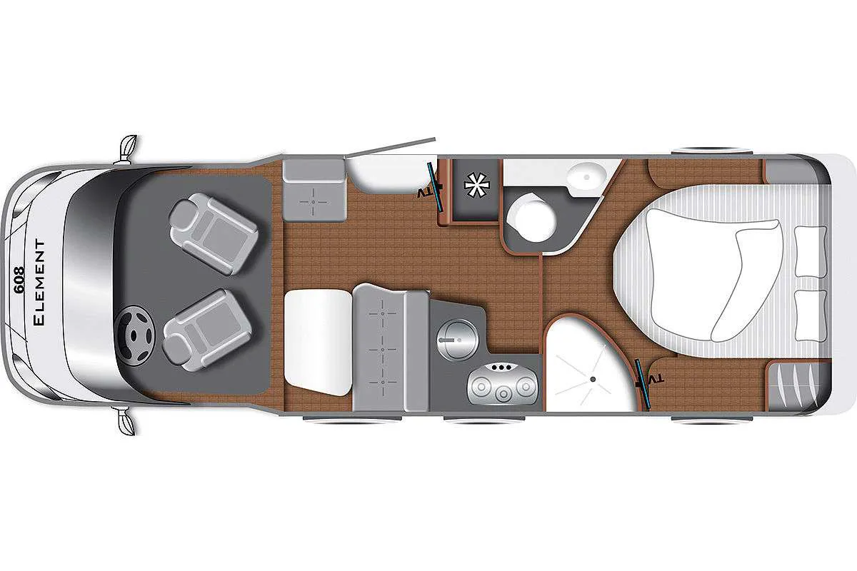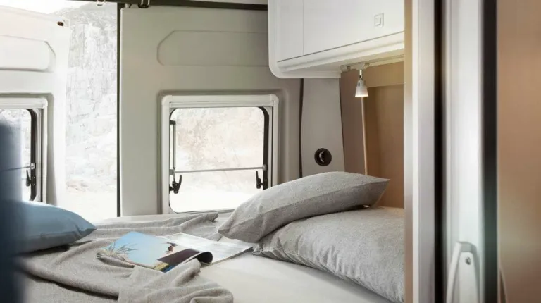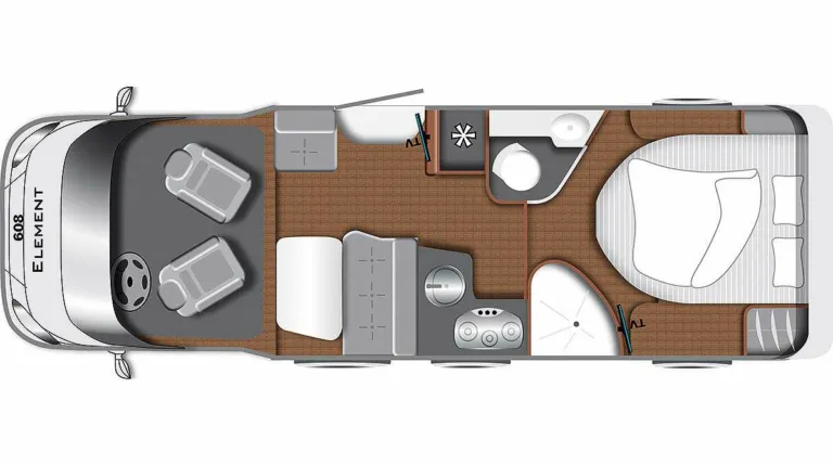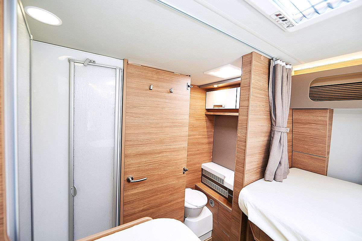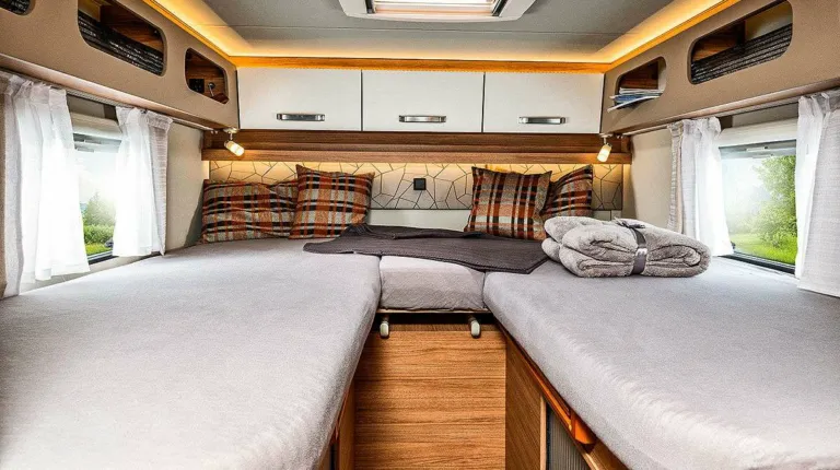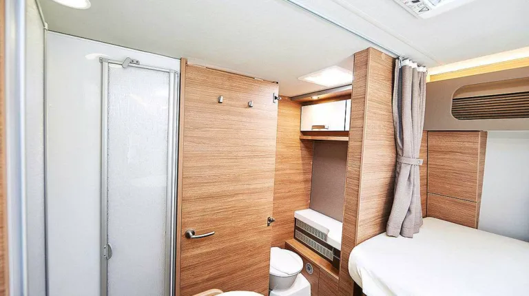В салоне есть односпальные кровати. Общая длина кемпера – 7 метров. Глухая дверь отделяет спальную и жилую зоны. В ванной комнате установлен кассетный туалет, небольшая раковина, душ, а также несколько отсеков.