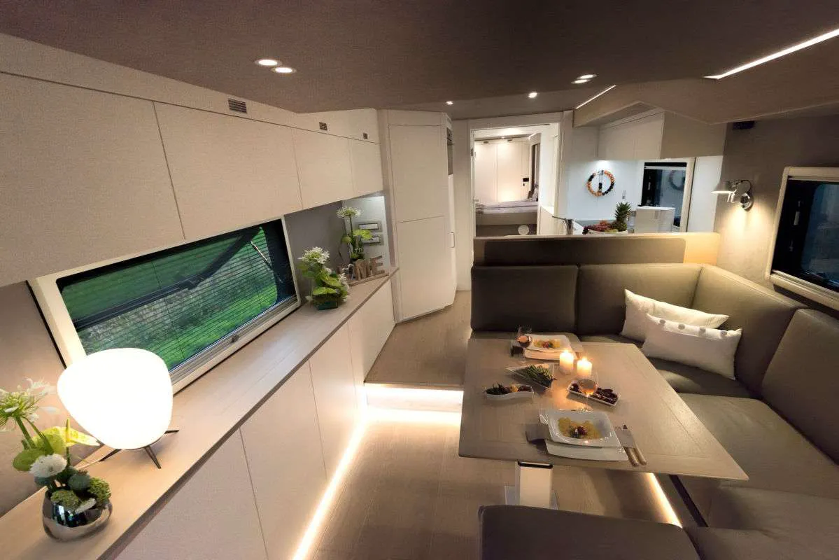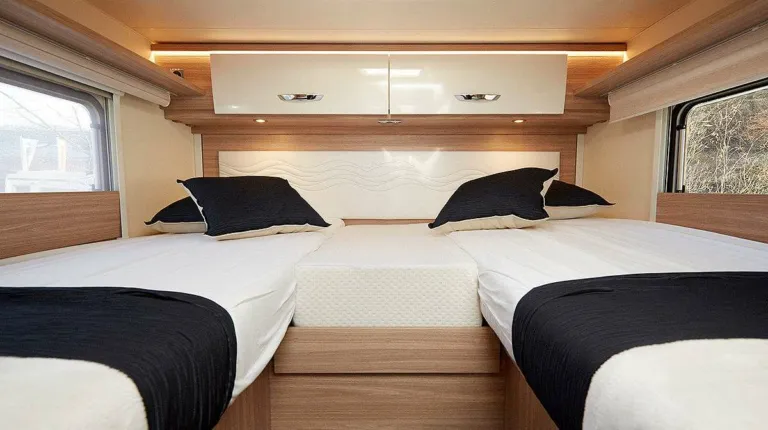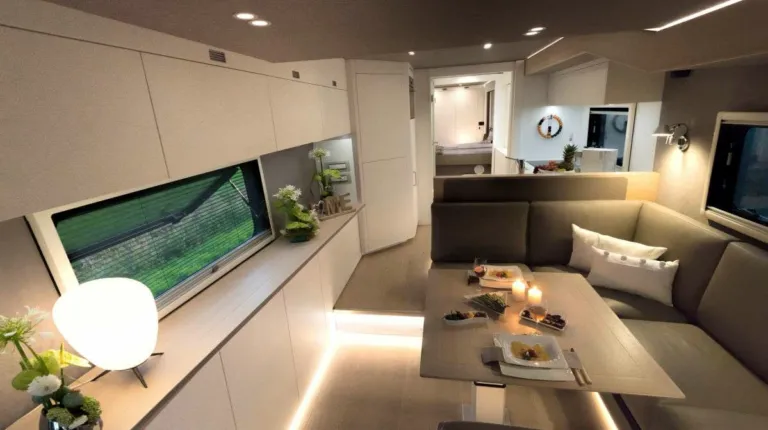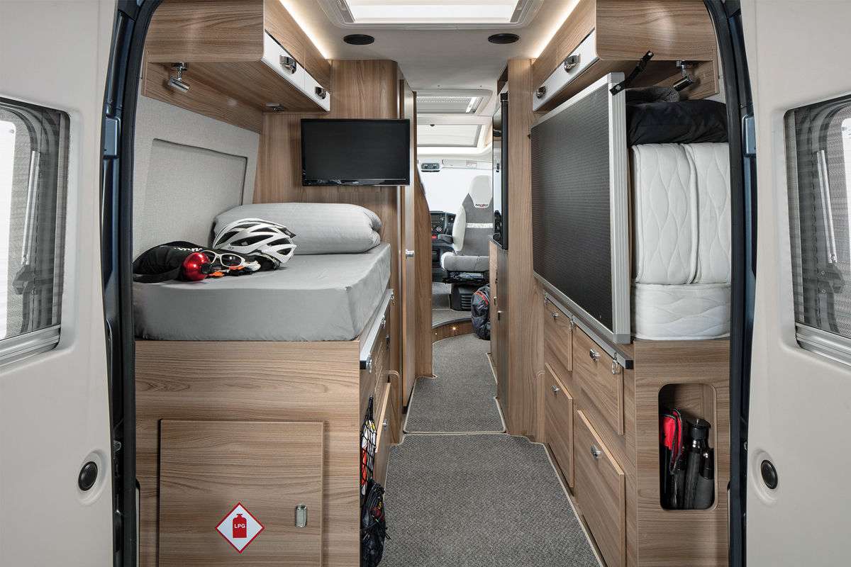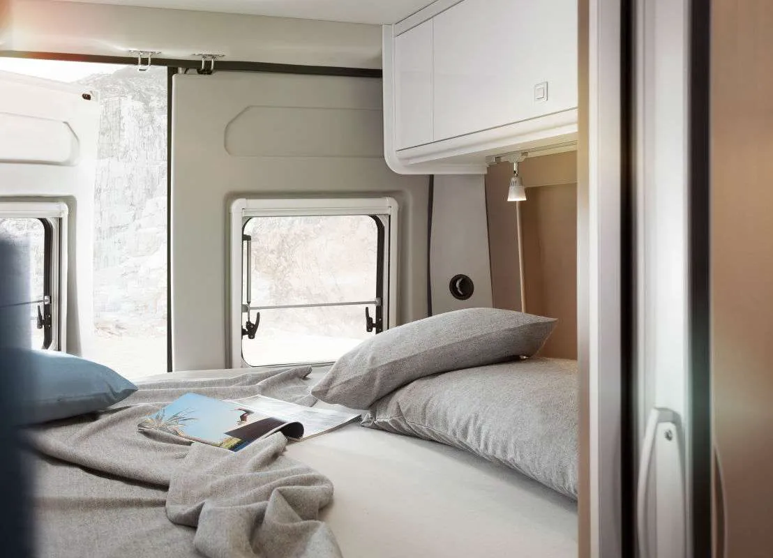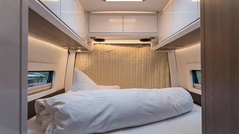 В салоне -124-литровый холодильник, включая морозильную камеру на 26 л. Здесь есть одна двуспальная кровать (1,53 × 2,05 ме), а также трехэтажная кровать (3 × 0,76 × 2,00 м). Интересно, что нижнюю кровать можно поднять и получить гараж для велосипедов.