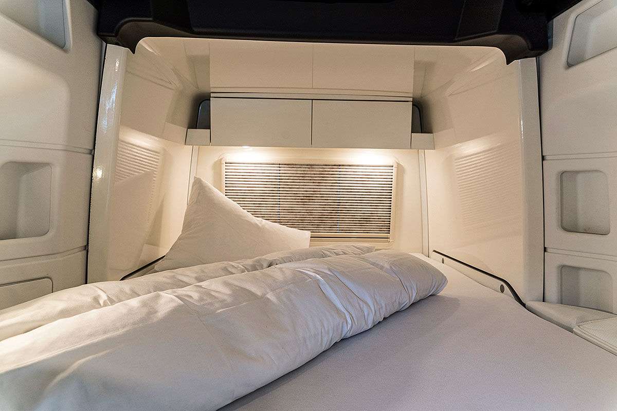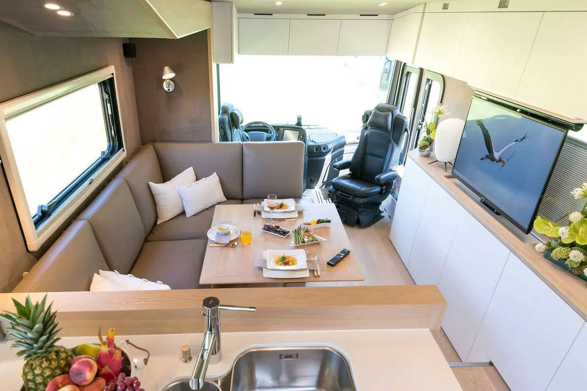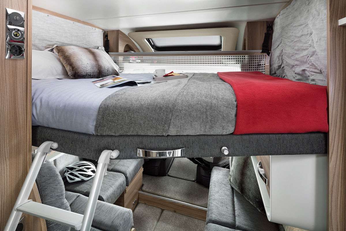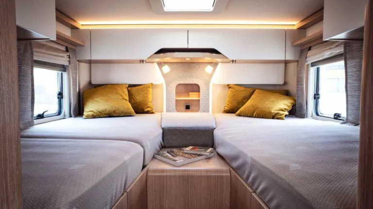 В салоне -124-литровый холодильник, включая морозильную камеру на 26 л. Здесь есть одна двуспальная кровать (1,53 × 2,05 ме), а также трехэтажная кровать (3 × 0,76 × 2,00 м). Интересно, что нижнюю кровать можно поднять и получить гараж для велосипедов.