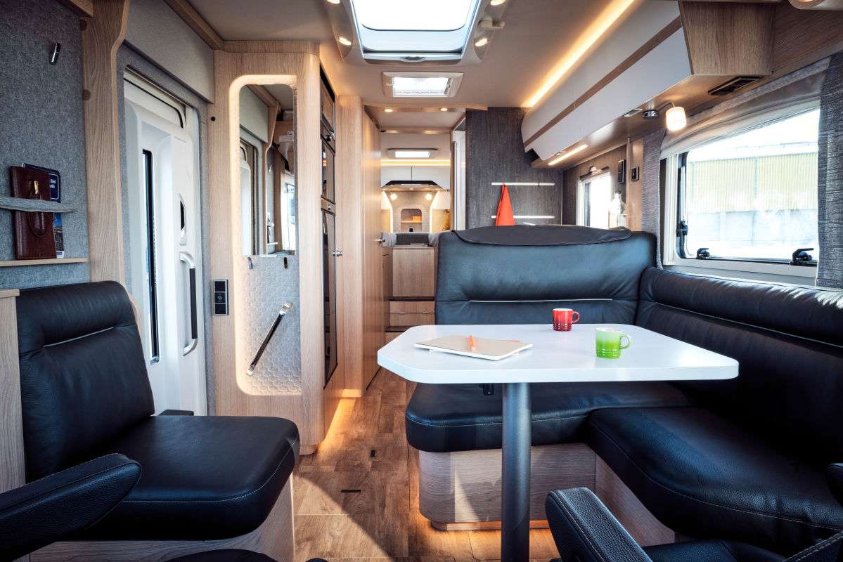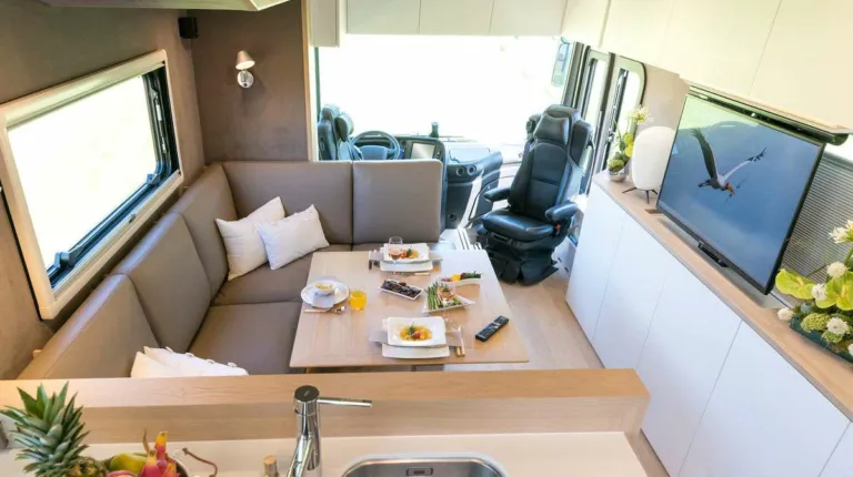 Еще одна яркая черта – раздвижная боковая стенка со стороны водителя, что значительно увеличивает полезный объем автодома на стоянке. Продольный кожаный диван можно заказать в нескольких цветах. В корме есть двуспальная кровать. Уют в вечернее время обеспечивает система увлажнения салона. Цена Perfection Relax стартует всего навсего от 850 000 евро.