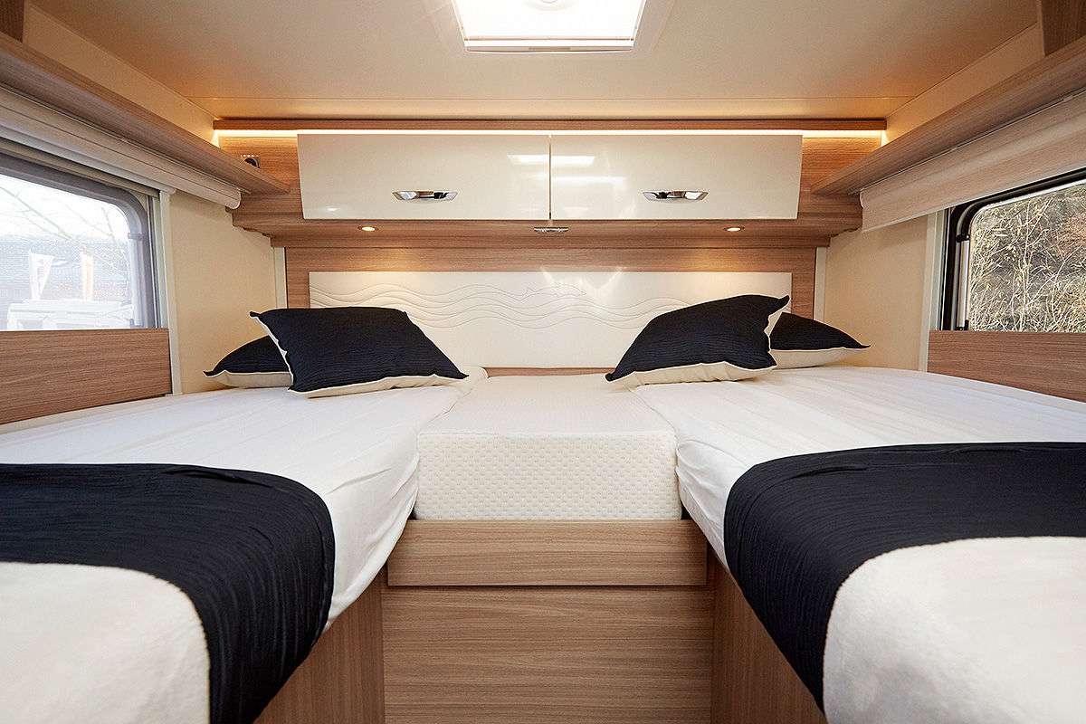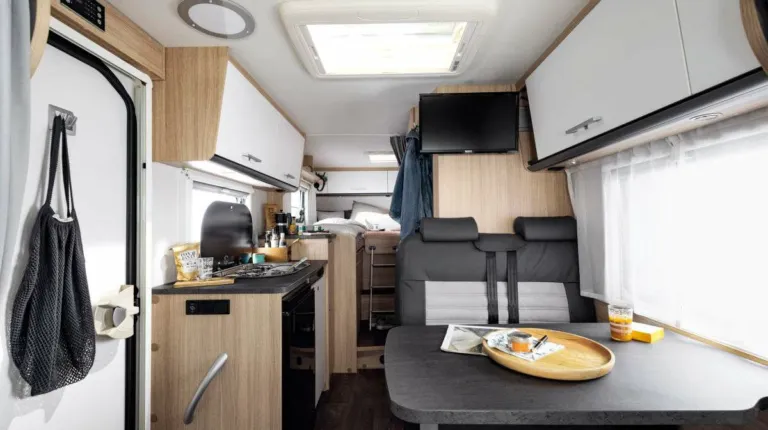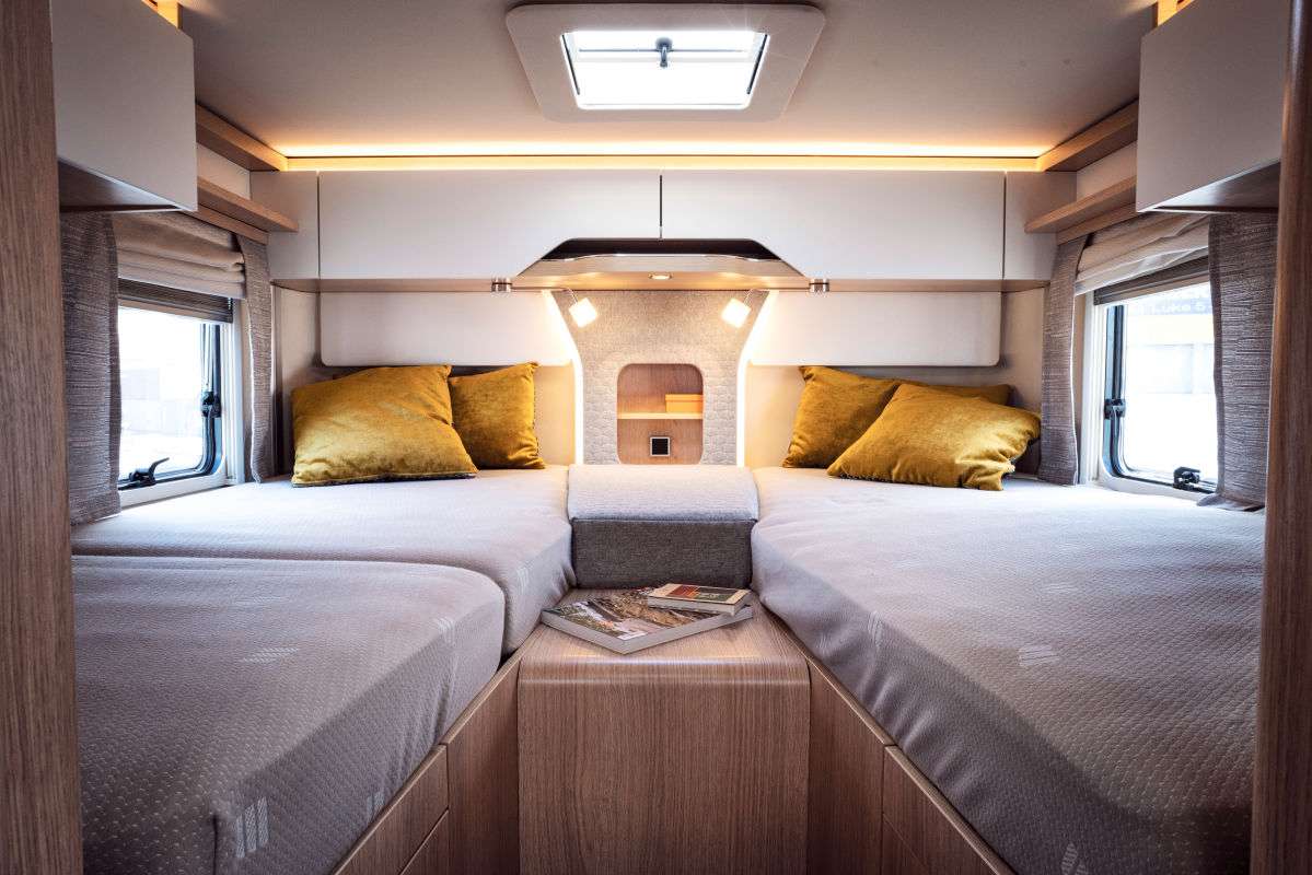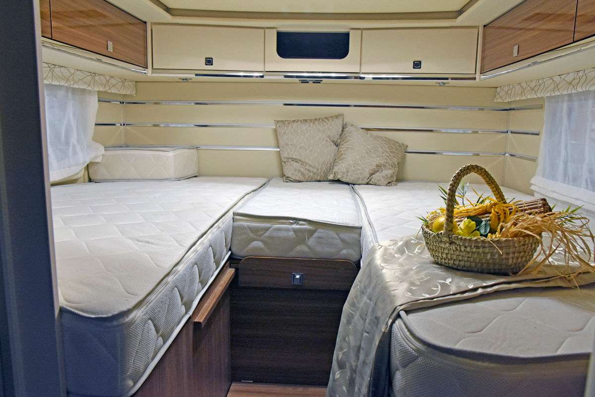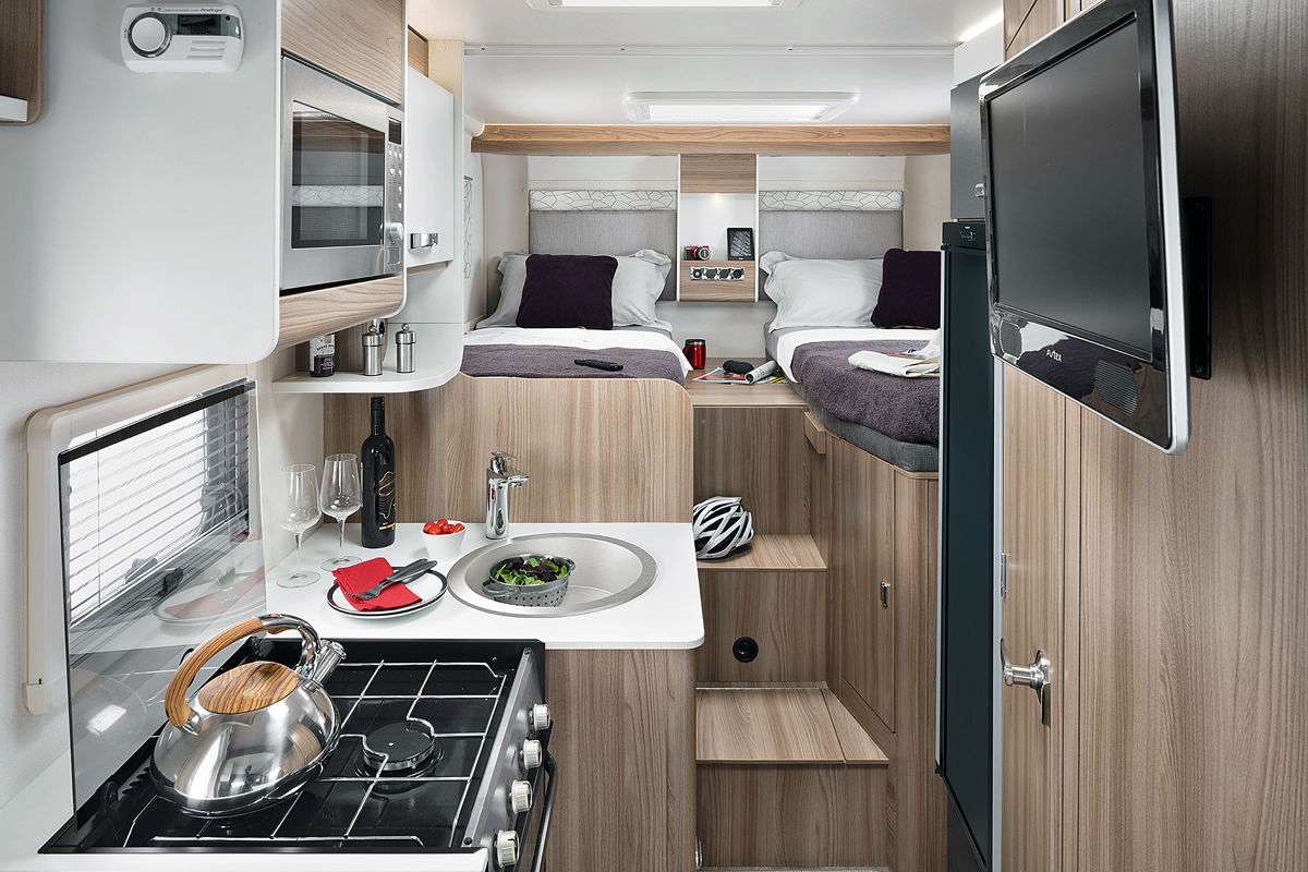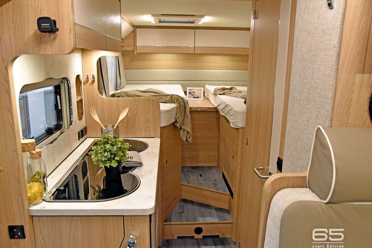 Модель T 726 G (от 54 490 евро) предлагается с двумя односпальными кроватями в корме. Здесь также есть L-образный кухонный блок, оснащенный раковиной из нержавеющей стали и газовой плитой с тремя конфорками.