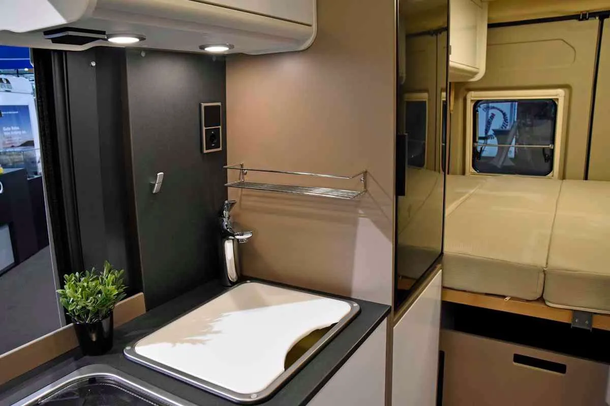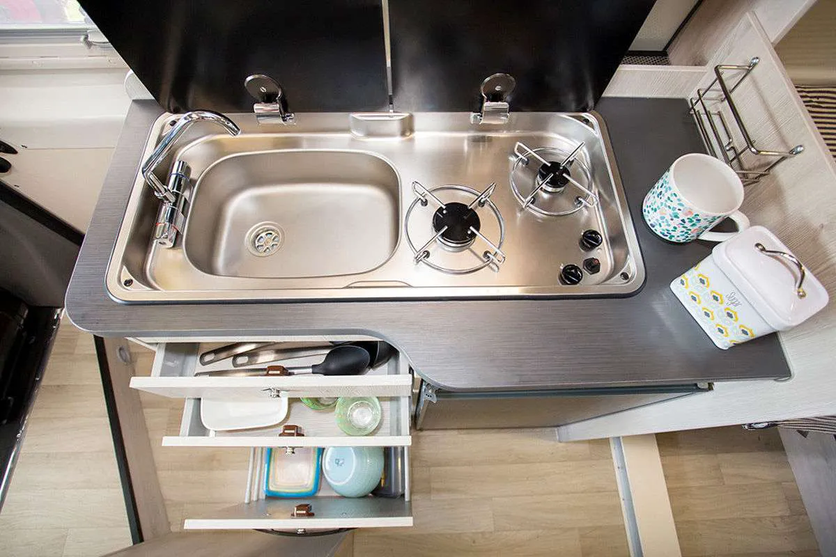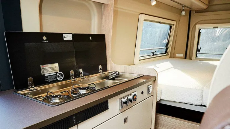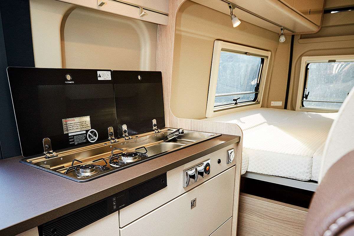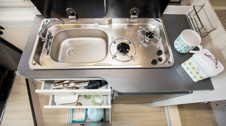 Кухня имеет большую двухконфорочную газовую плиту и 80-литровый холодильник. Ванной комнаты нет, но зато имеется душевой шланг, который проходит от кухонной раковины и доходит до двери. Туалет спрятан в выдвижной секции внизу.