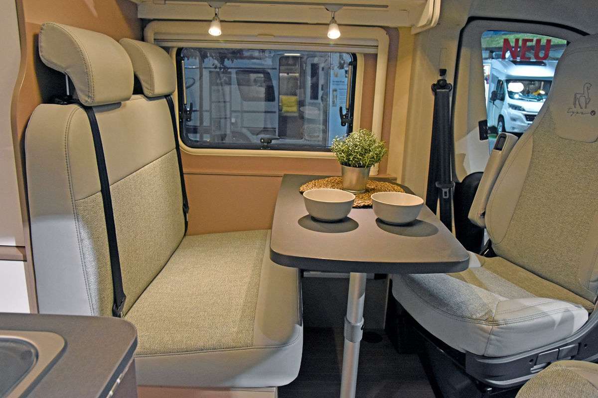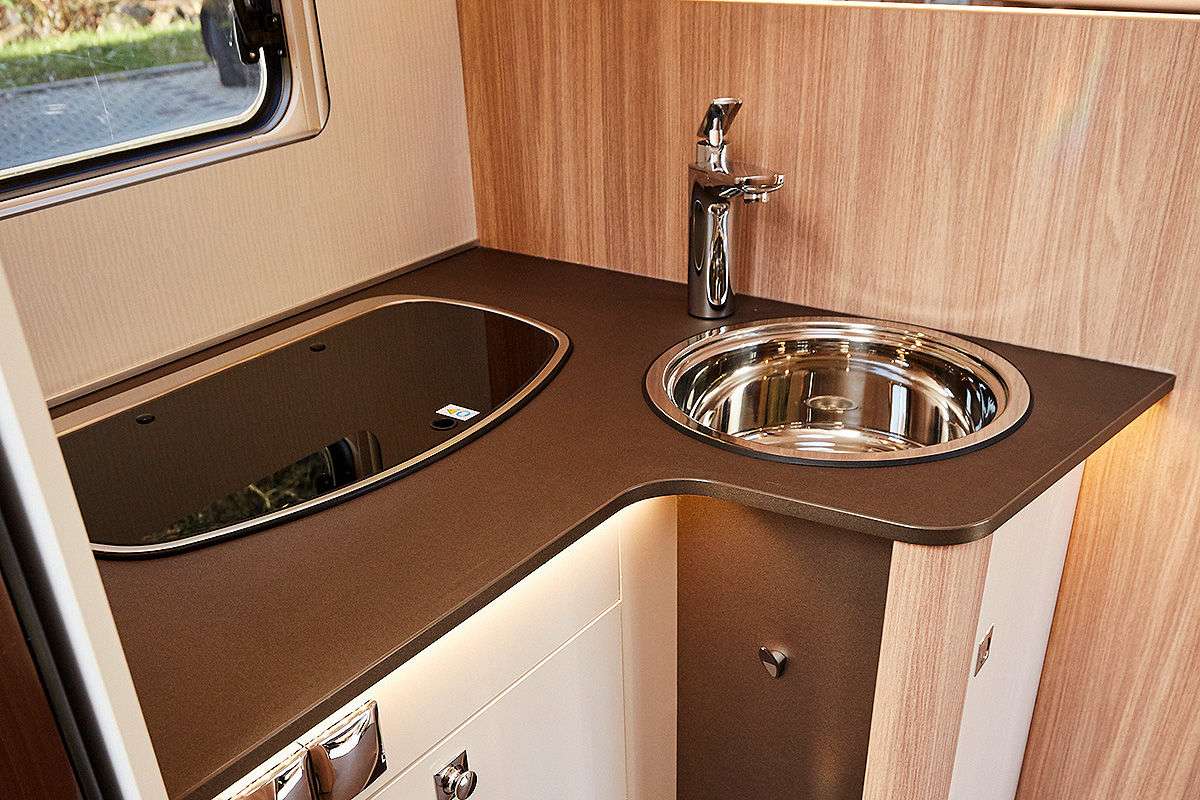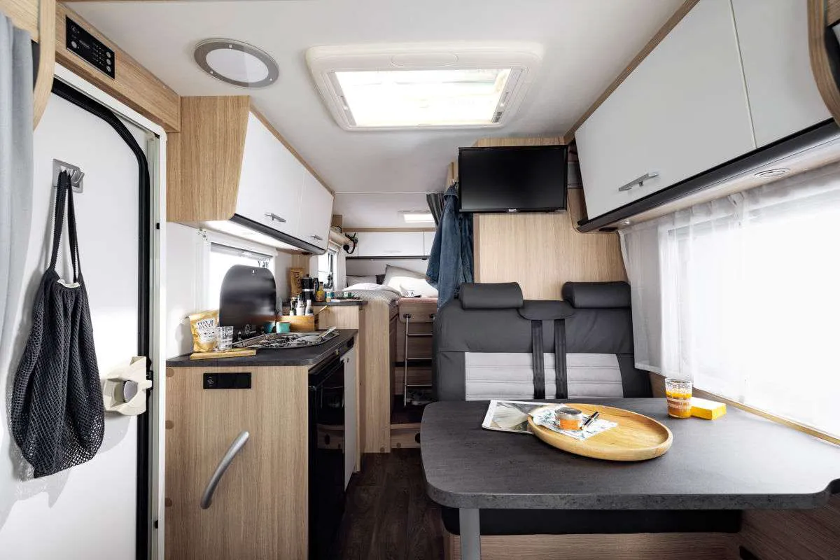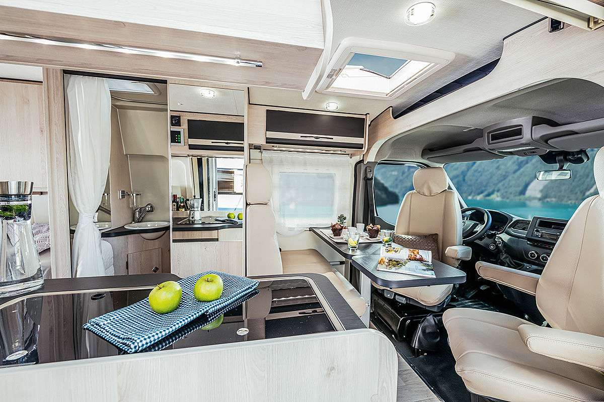 Bürstner также предлагает новинку и в сегменте кемпер-венов. С 2020 года в продажу поступит модель Campeo – по цене от 38 590 евро. В качестве опции (за 3790 евро) для всех трех вариантов можно установить раздвижную крышу. Салон выглядит просторно, холодильник установлен в глубине, за раздвижной дверью. Деревянного декора немного.