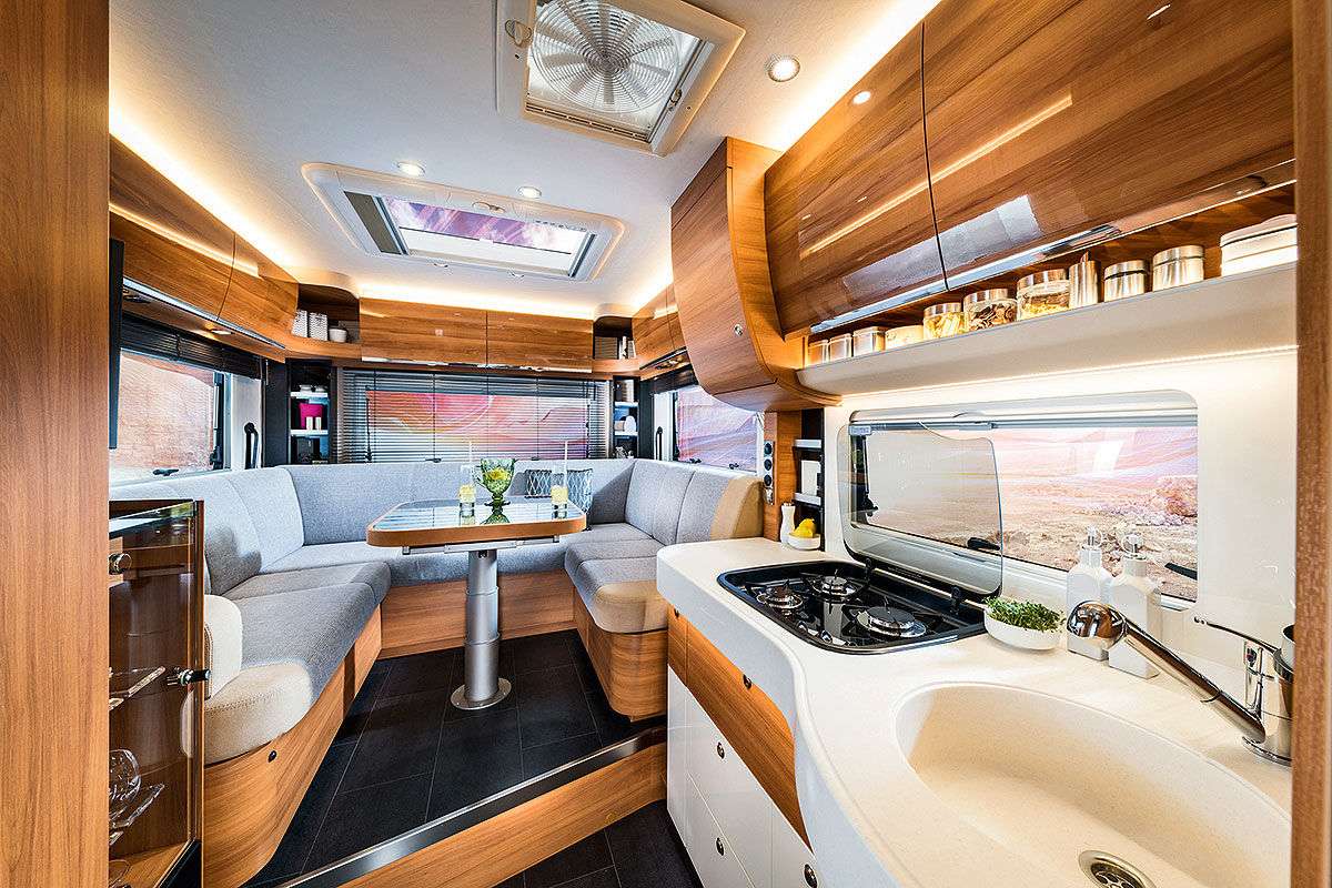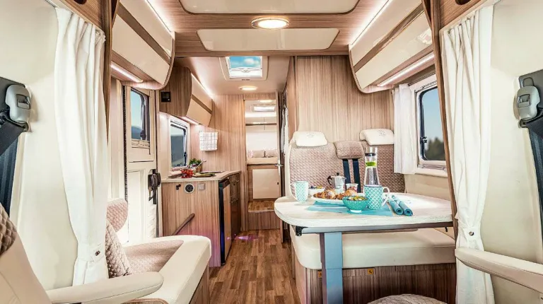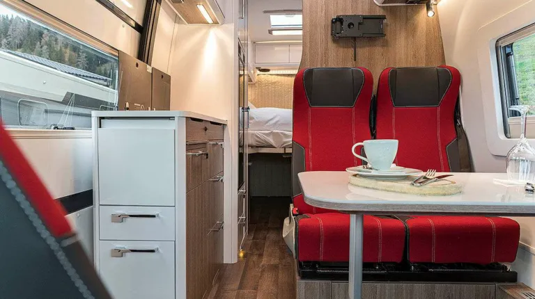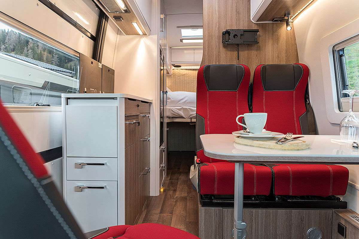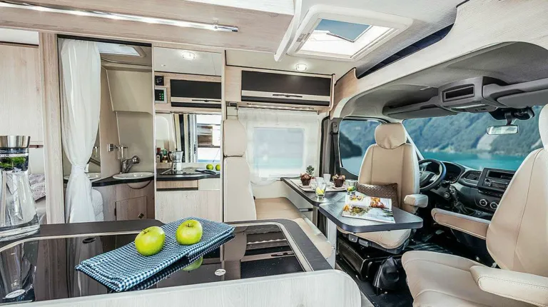Bürstner также предлагает новинку и в сегменте кемпер-венов. С 2020 года в продажу поступит модель Campeo – по цене от 38 590 евро. В качестве опции (за 3790 евро) для всех трех вариантов можно установить раздвижную крышу. Салон выглядит просторно, холодильник установлен в глубине, за раздвижной дверью. Деревянного декора немного.