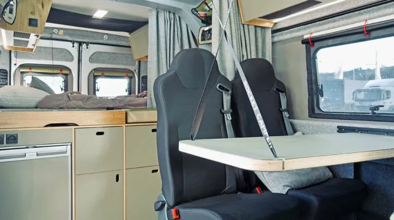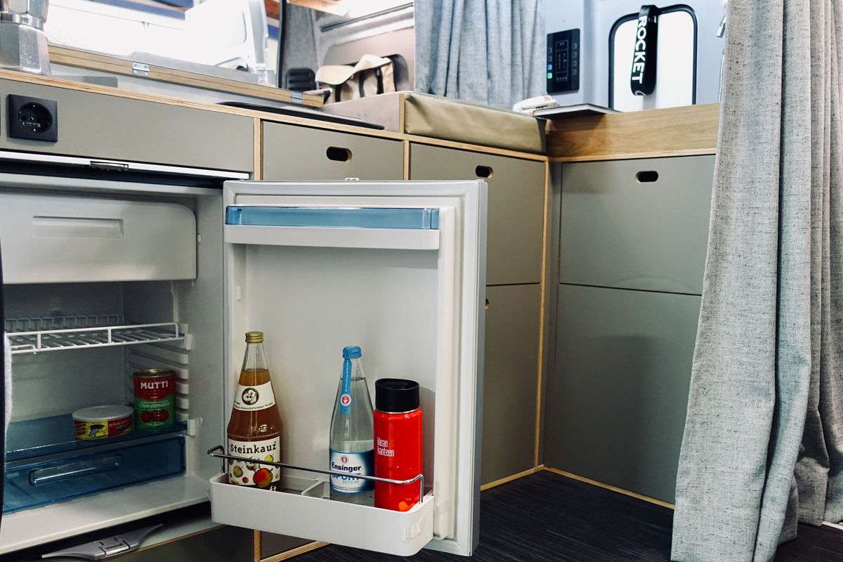 Внутри Rocket One имеет нестандартную планировку для классического кемпер-вена. Слева от раздвижной двери, в корме расположена мебельная стенка, которая состоит из модульных секций. Сверху – натуральное дерево.