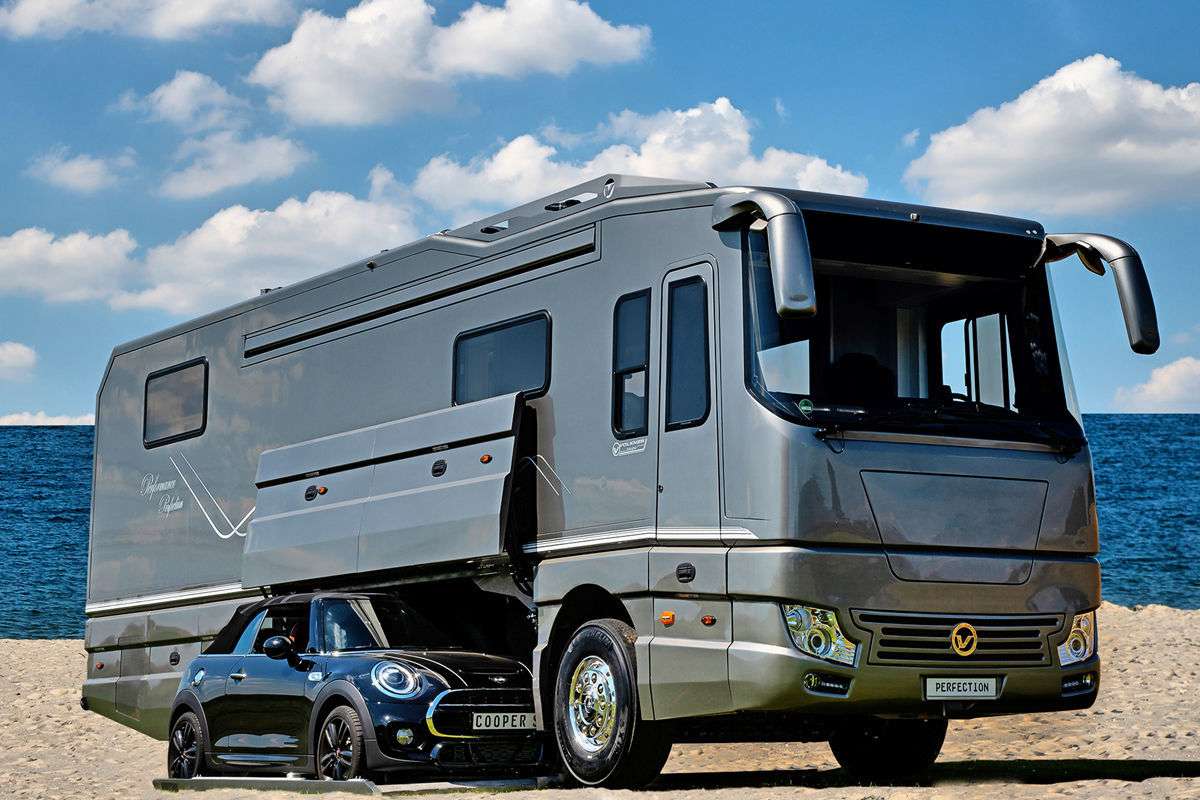 Компания Wolkner Mobil представляет новый кемпер Perfection Relax. Этот люксовый лайнер на шасси Volvo по габаритам соизмеримый с современными туристическими автобусами. Изюминкой является запатентованная конструкция гаража – в средней части, под полом. Сюда легко поместится небольшой автомобиль типа MINI или Fiat 500.
