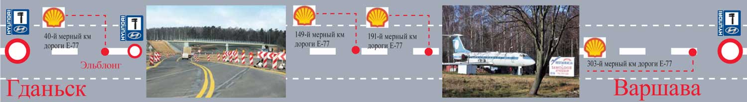 Примерно в 100 км от Гданьска на трассе во время нашей поездки в конце 2011 года велись строительные работы. Судя по масштабам стройки, скоро здесь появится скоростная автомагистраль. Сейчас на этом участке дороги действует ограничение скорости до 50–70 км/ч. Через 30 км строительство заканчивается и начинается скоростная многополосная дорога, на которой можно разогнаться до 110 км/ч. По дороге из Варшавы в Гданьск мы насчитали 22 АЗС, 8 из которых – в попутном направлении. В 20 км от Варшавы по правой стороне находится АЗС Shell, на которой можно заправиться не только бензином Euro Super 95 – аналог отечественного А-95, но и известным украинскому потребителю фирменным V-Power.