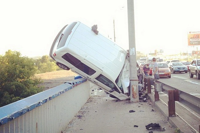 Как сообщает пресс-служба столичной ГАИ, причина – превышение скорости водителем. Один из водителей пострадал, у него сотрясение головного мозга, второй отказался от медпомощи. «Белый VW стоит просто на носу, задними колесам вверх, я такого никогда не видел», - по информации «Сегодня», рассказывает очевидец Николай. Движение на мосту остановилось, люди идут на Троещину пешком. Пробки растянулись по Телиги и Довженко, до Шулявки. Сотрудники ГАИ говорят, что пробки усугубляют водители, которые притормаживают, чтобы сфотографировать на телефоны происшествие и обращаются с просьбой не усугублять пробки.