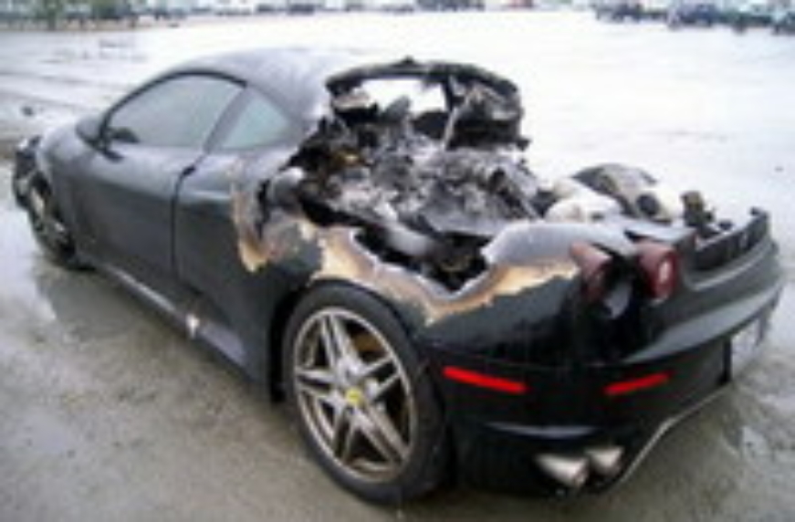 Авария случилась абсолютно внезапно, во время неспешной поездки по городу: из-под капота (автомобиль среднемоторной компоновки) «жеребца» сперва повалил густой дым, а потом и огонь. Растерянный водитель не смог самостоятельно справится с пожаром, а прибывшие на место ЧП спасатели подоспели с опозданием: пламя практически полностью уничтожило заднюю часть дорогой машины.