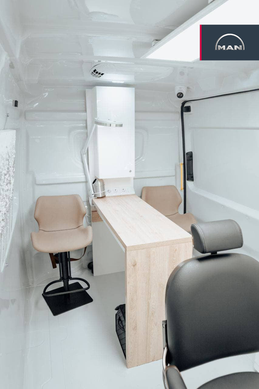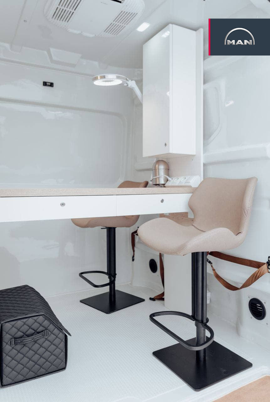 Это первый мобильный салон красоты Mobbea, который создали прямо в развозном фургоне MAN TGE 3.140. Для этого использовали один из самых вместительных его вариантов – длиннобазный, с высокой крышей (L4H3) – с полезным объемом грузового отсека 14,4 м куб. При габаритной длине 6,8 м и высоте 2,59 м полная масса составляет 3,5 т. В движение машину приводит 140-сильный турбодизельный двигатель.