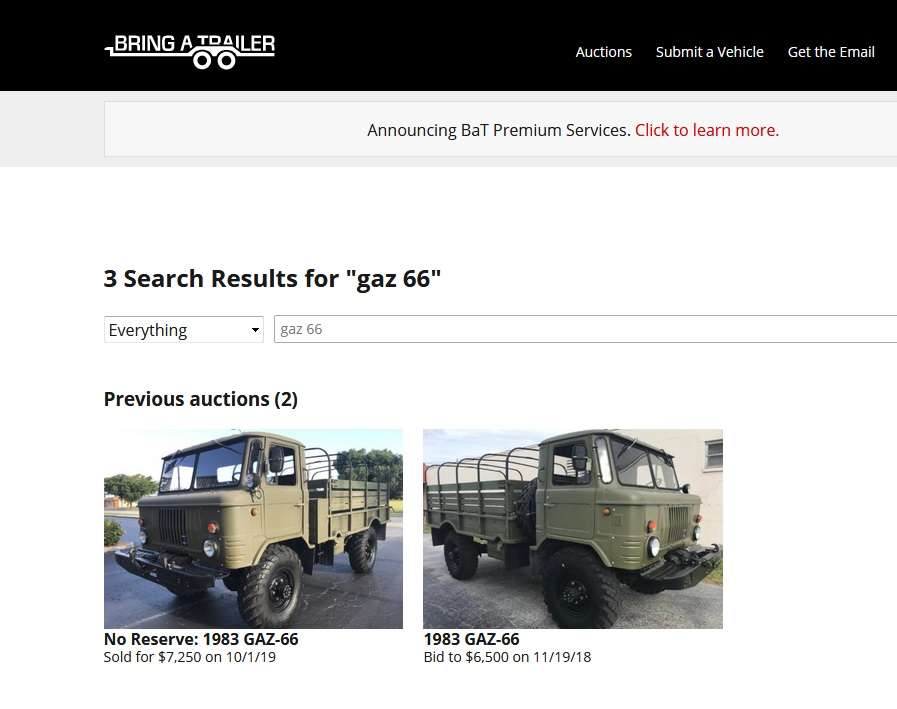 На американському інтернет-аукціоні Bring А Trailer у вівторок, 1 жовтня було реалізовано цікавий лот – радянський армійський всюдихід ГАЗ-66. За машину виручили хороші гроші, на які в США можна придбати розкішний родстер Cadillac Allante, причому останніх років випуску.