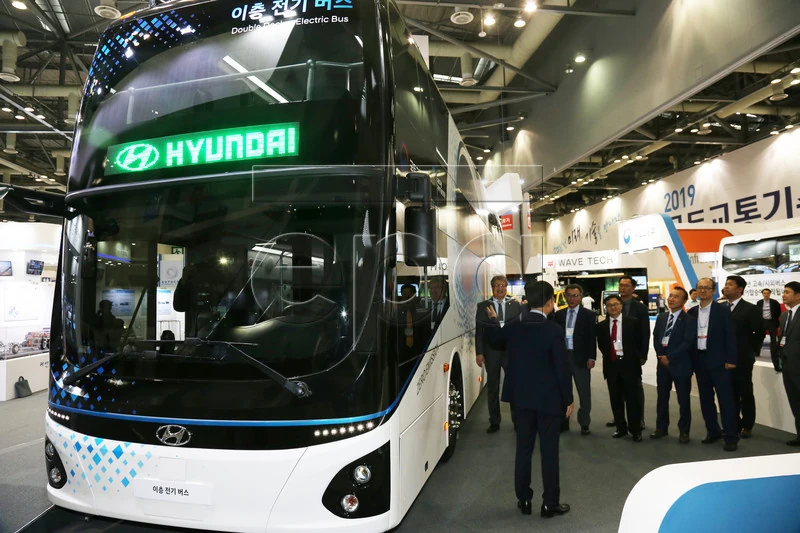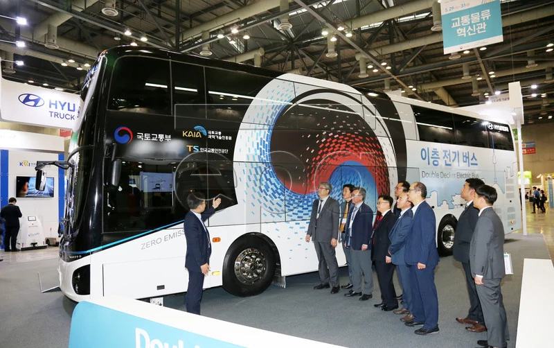 Двухэтажный электробус Hyundai презентовали 29 мая в Сеуле, в рамках выставки Land Infrastructure and Transport Technology Fair. Машина имеет длину 12 980 мм и высоту 3995 мм и способна взять на борт 70 пассажиров, что в 1,5 раза больше, чем одноэтажные электробусы. На первом этаже размещается 11 мест, на втором – 59.