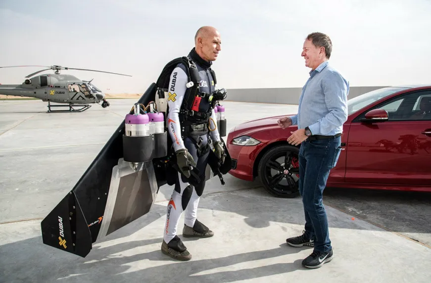 Великий британский гонщик Мартин Брандл и швейцарский летчик и изобретатель Ив Росси поспорили, что их транспортные средства окажутся быстрее. Мартин Брандл сел за руль новейшего заряженного седана Jaguar XJR, с двигателем V8 мощностью 550 л.с. Максимальная скорость машины, в конструкции которой широко использован алюминий – 280 км/ч. Интересно, что Брандл в 1990 году одержал победу в гонке «24 часа Ле-Мана» на машине Jaguar XJR-12. Так что как укрощать «диких кошек» он знает не понаслышке.