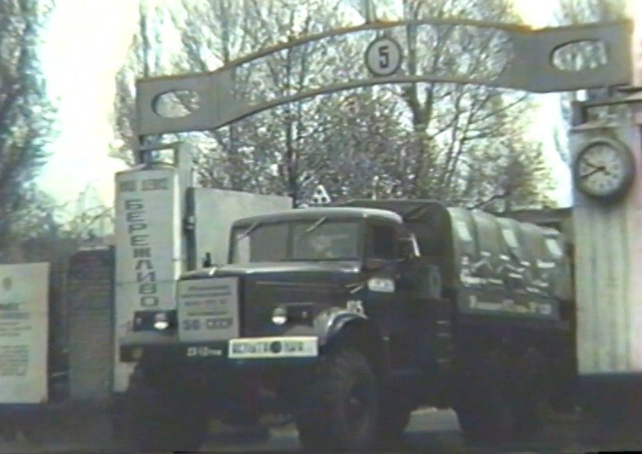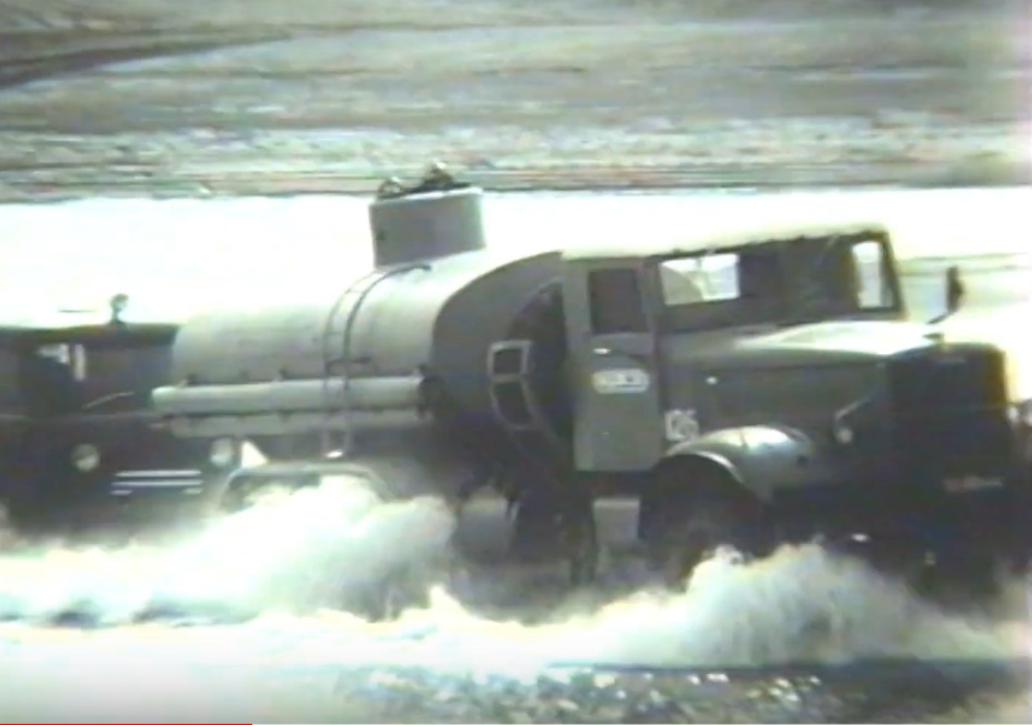 Так, на одном фрагменте видеоролика видно как тропический КрАЗ задним ходом вытаскивает из воды автоцистерну. А на другом фрагменте уже сама автоцистерна КрАЗ-255Б буксирует другой автотопливозаправщик, на шасси ГАЗ-51, который застрял в водоеме.